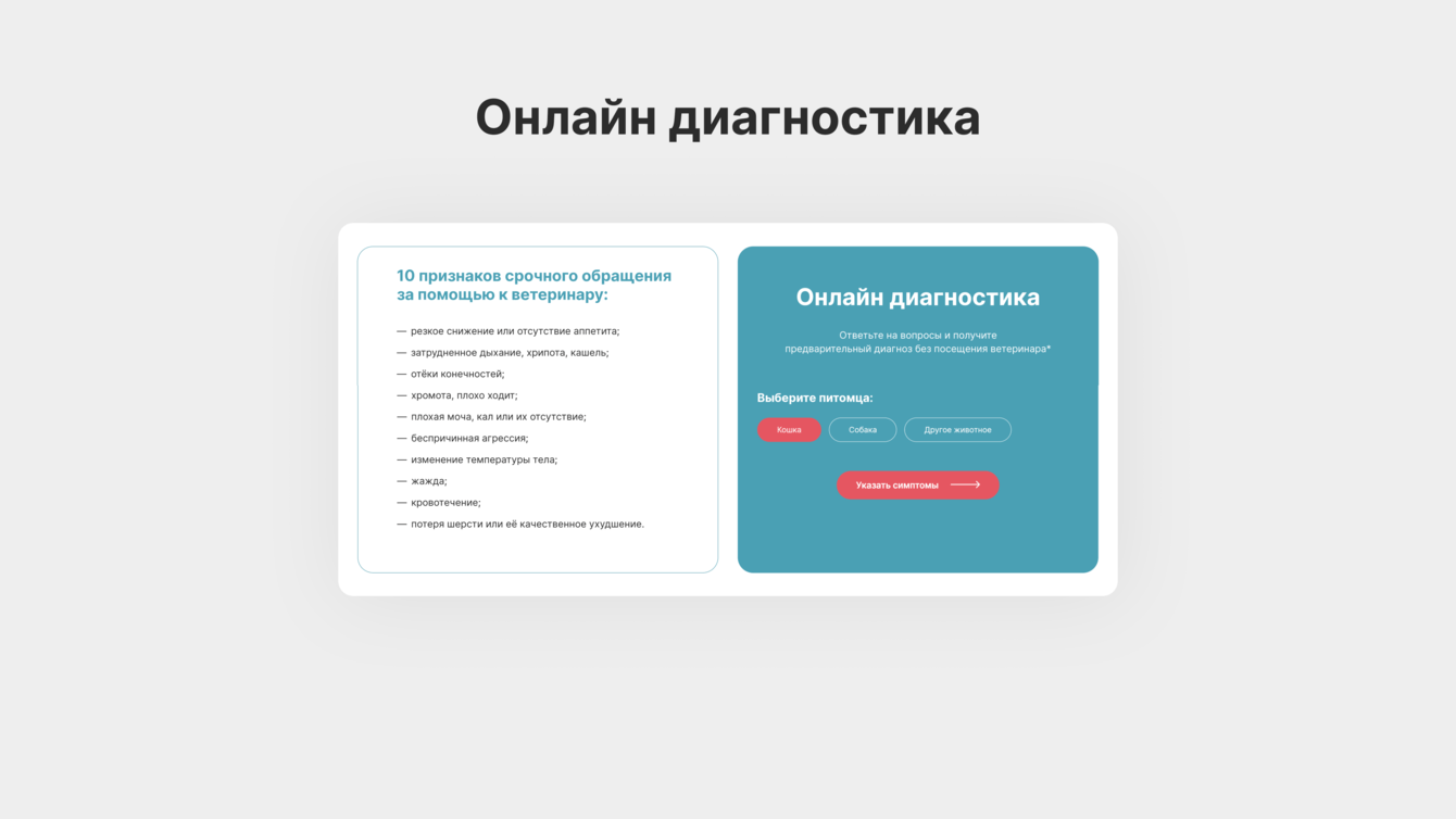 ЭТО НЕ КВИЗ! Терпеть не можем обманные тесты, где за результат просят контактные данные. Этот сервис реально помогает людям сузить круг возможных заболеваний. Он был реализован еще на прошлом сайте, но мы, конечно же, нашли, что улучшить и как сделать его более удобным для пользователя.