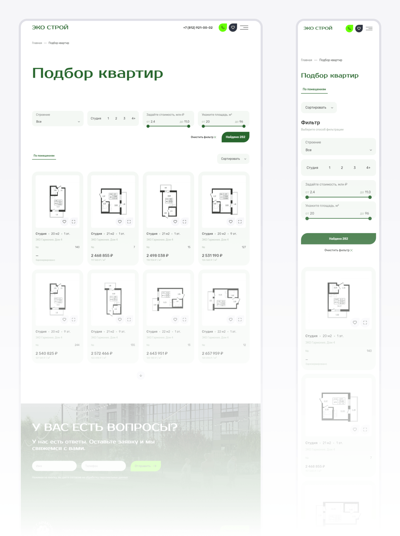 Простой и интуитивно понятный интерфейс подбора квартир. Быстрая реакция интерфейса позволяет мгновенно получать результаты поиска и просматривать доступные варианты. Кроме того, сайт интегрирован с Profitbase, что гарантирует актуальность и точность информации о недвижимости.