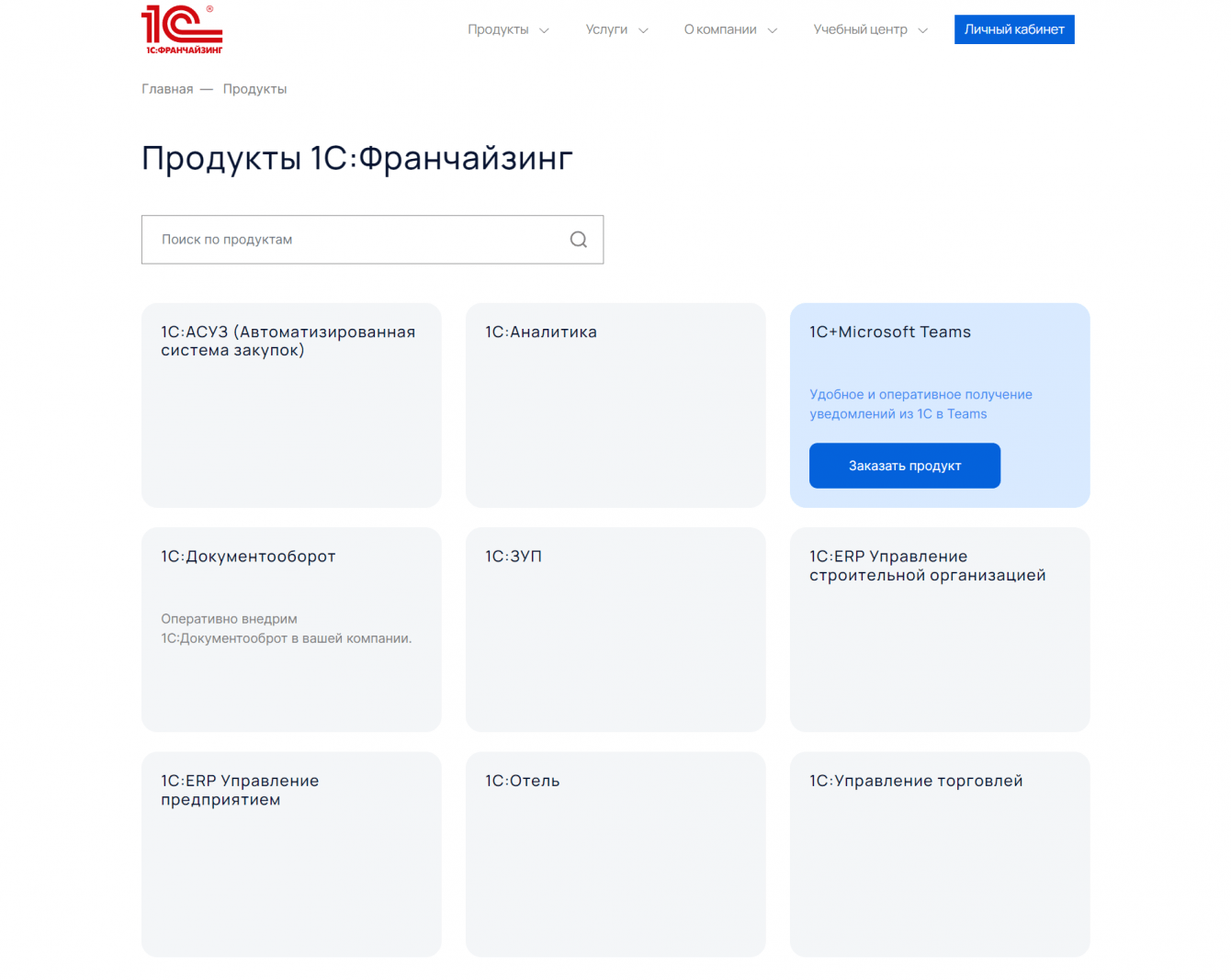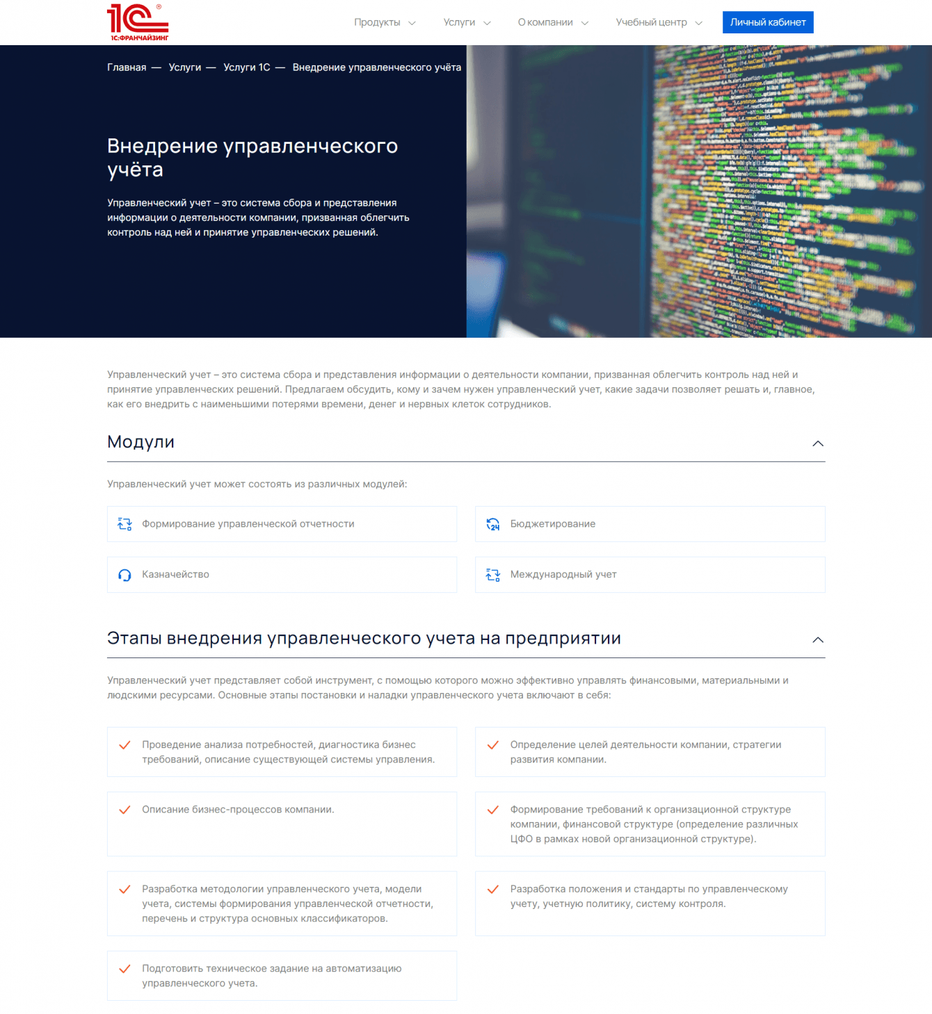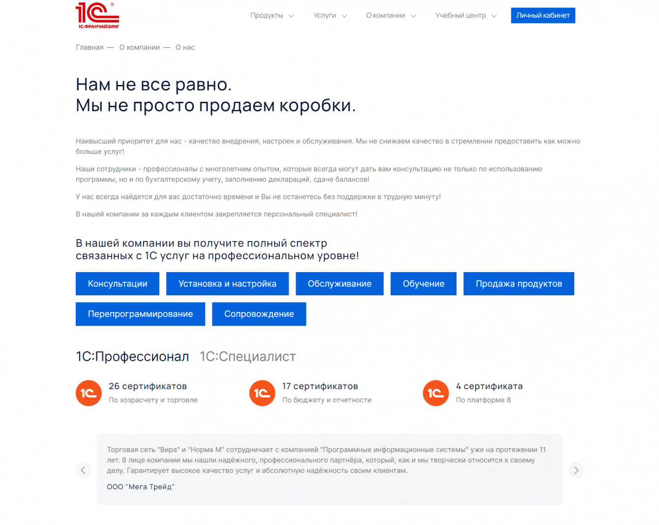 Помимо продуктов 1С, компания предоставляет различные услуги в нескольких категориях. На сайте представлена удобная навигация и удобное переключение по разным видам услуг.