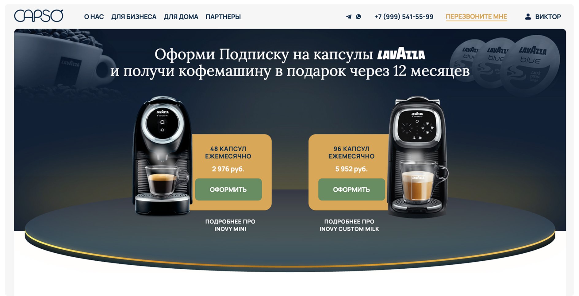 На некоторых промостраницах доступен дополнительный режим, в котором кофемашина переходит в собственность клиента после 12 месяцев ежемесячной покупки капсул. В каждой подписке можно менять состав заказа.