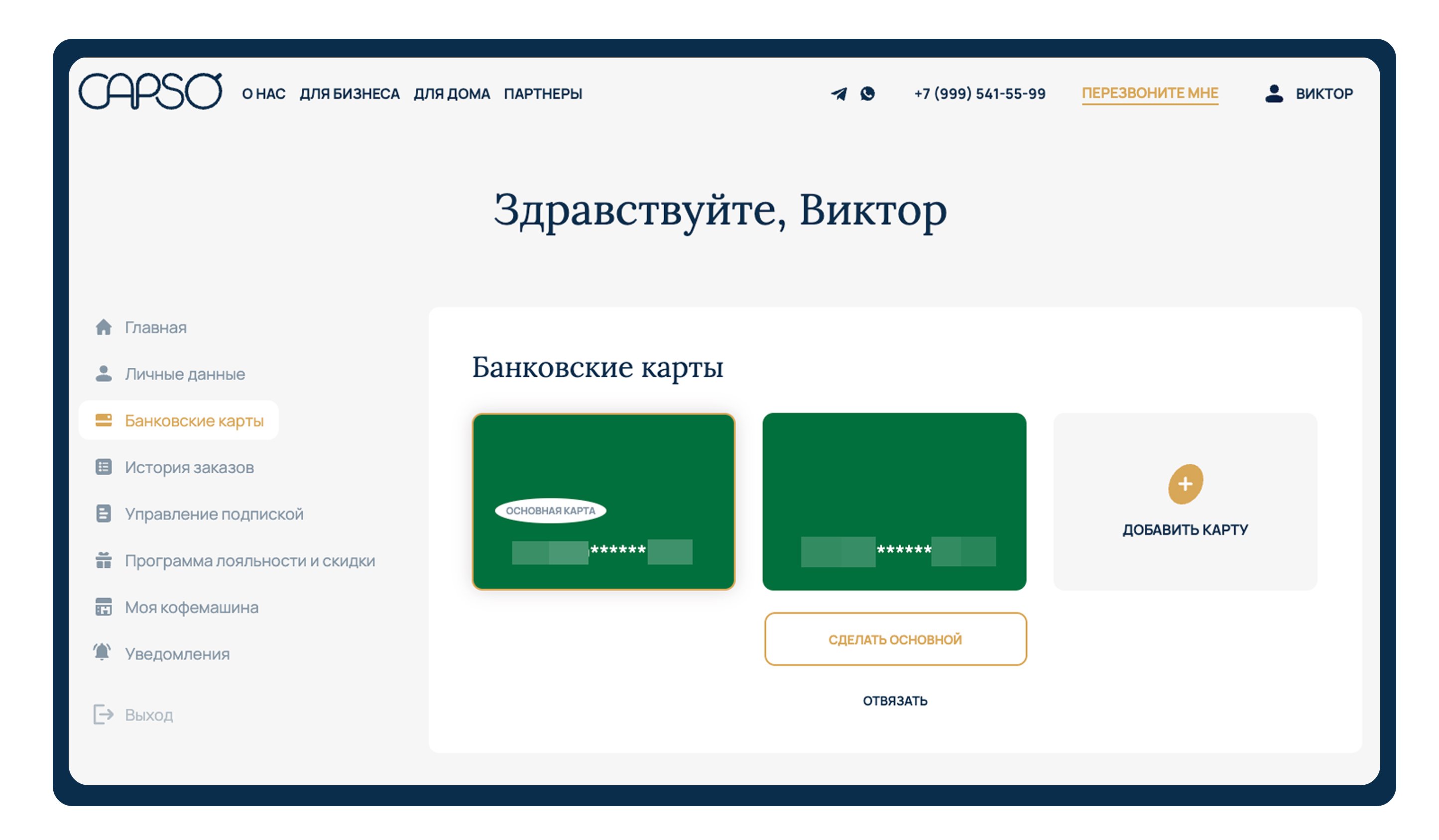 Для удобства пользователей в личном кабинете предусмотрено управление банковскими картами.