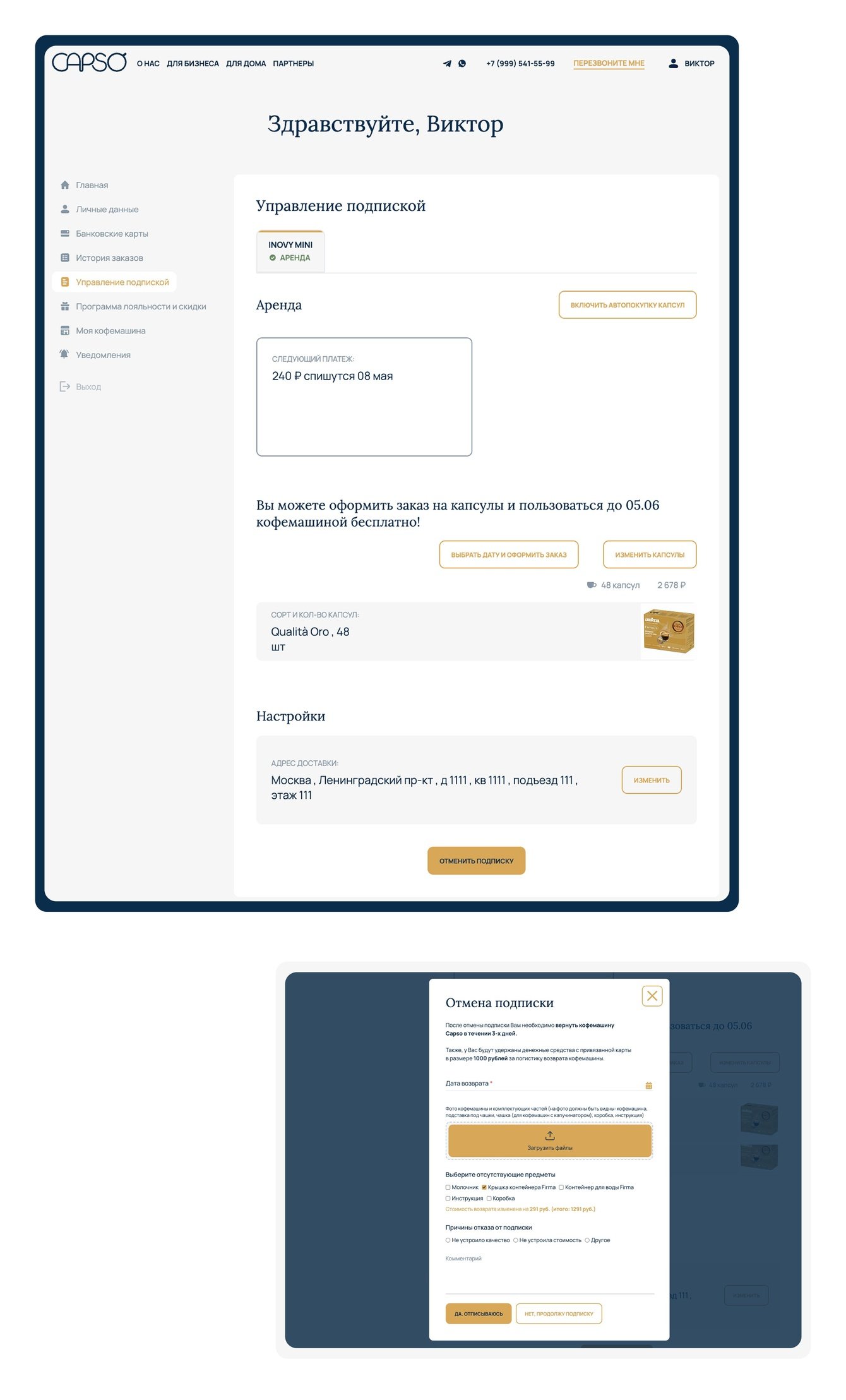 Основная цель заключалась в создании удобного и гибкого сервиса аренды кофемашин, который позволял бы пользователям получать оборудование на выгодных условиях, автоматизировать заказы капсул и управлять подпиской в удобном формате.