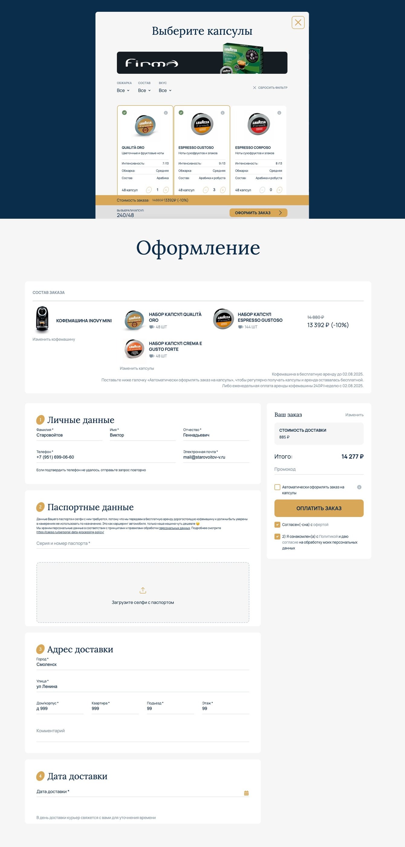 Процесс оформления заказа интуитивно понятен. Клиенту предлагается выбор тарифного плана, а система автоматически рассчитывает доступное количество капсул в зависимости от выбранной кофемашины.