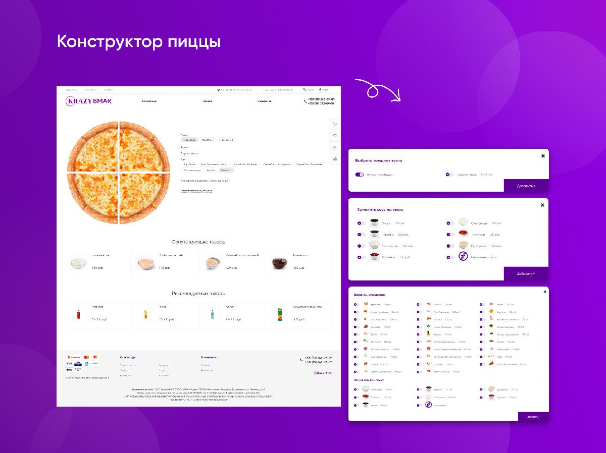 1. Конструктор пиццы. Реализован функционал конструктор пицц, который позволяет собрать пиццу из четвертинок различных пицц. Также на странице представлен информационный Pop-up с вариантами оплаты и доставки. В конструкторе пиццы возможно выбрать диаметр пиццы, борт, толщину теста (толстое или тонкое), соус на тесто и на пиццу (ассортимент представлен в 7 вариантах соуса), а также широкий ассортимент дополнительных ингредиентов, которые можно добавить в уже собранную пиццу.