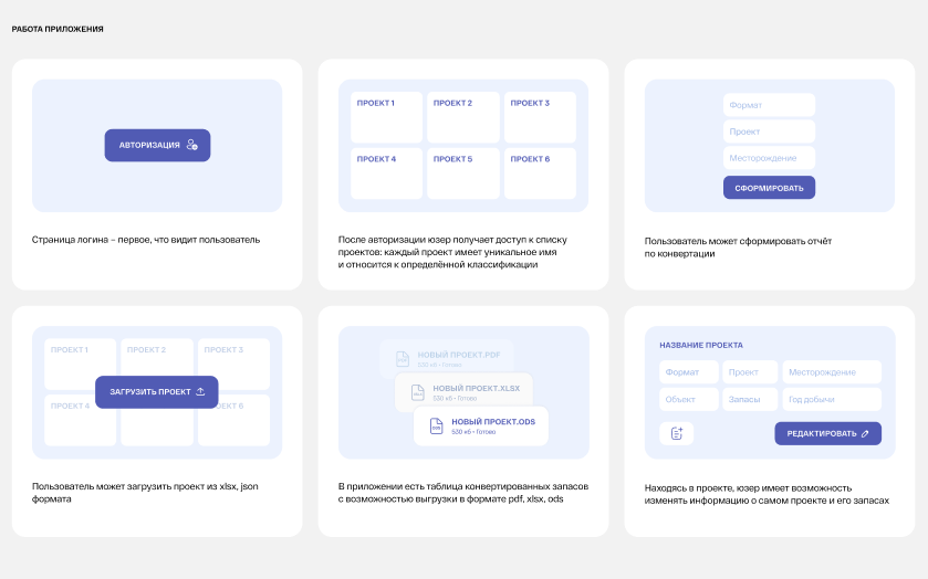 Веб-приложение позволяет удобно хранить информацию о запасах различных месторождений, проводить конвертацию в различные классификации, анализировать полученную информацию благодаря табличному и графическому представлению, создавать и выгружать файлы-отчёты, агрегирующие информацию по месторождениям.
