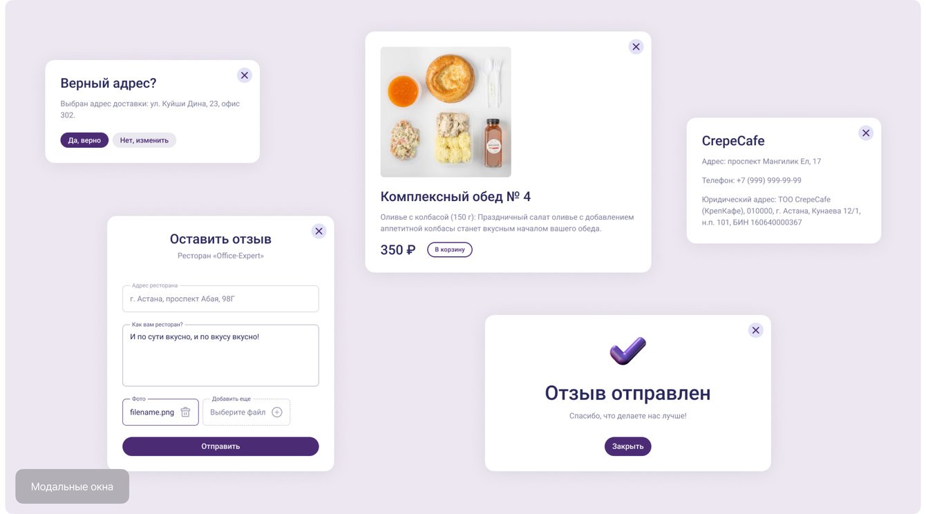 Через модальные окна можно подтвердить адрес доставки, оставить отзыв о ресторане, ознакомиться с юридической информацией заведения или просмотреть детали выбранного блюда. Данный подход экономит время и сохраняет контекст работы пользователя.