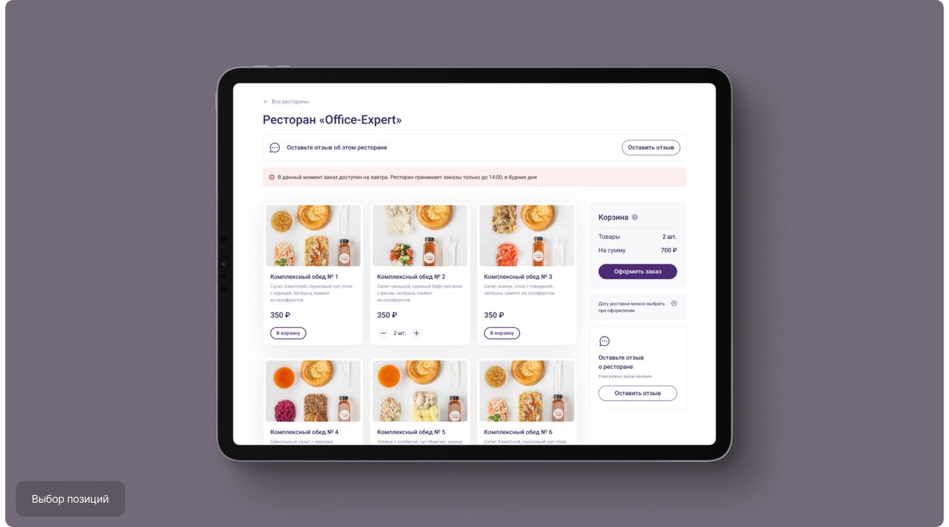 Интерфейс одинаково удобно работает как на десктопе, так и на мобильных устройствах, что позволяет сотрудникам планировать питание в любое время и оформлять заказ в несколько шагов без лишних действий.
