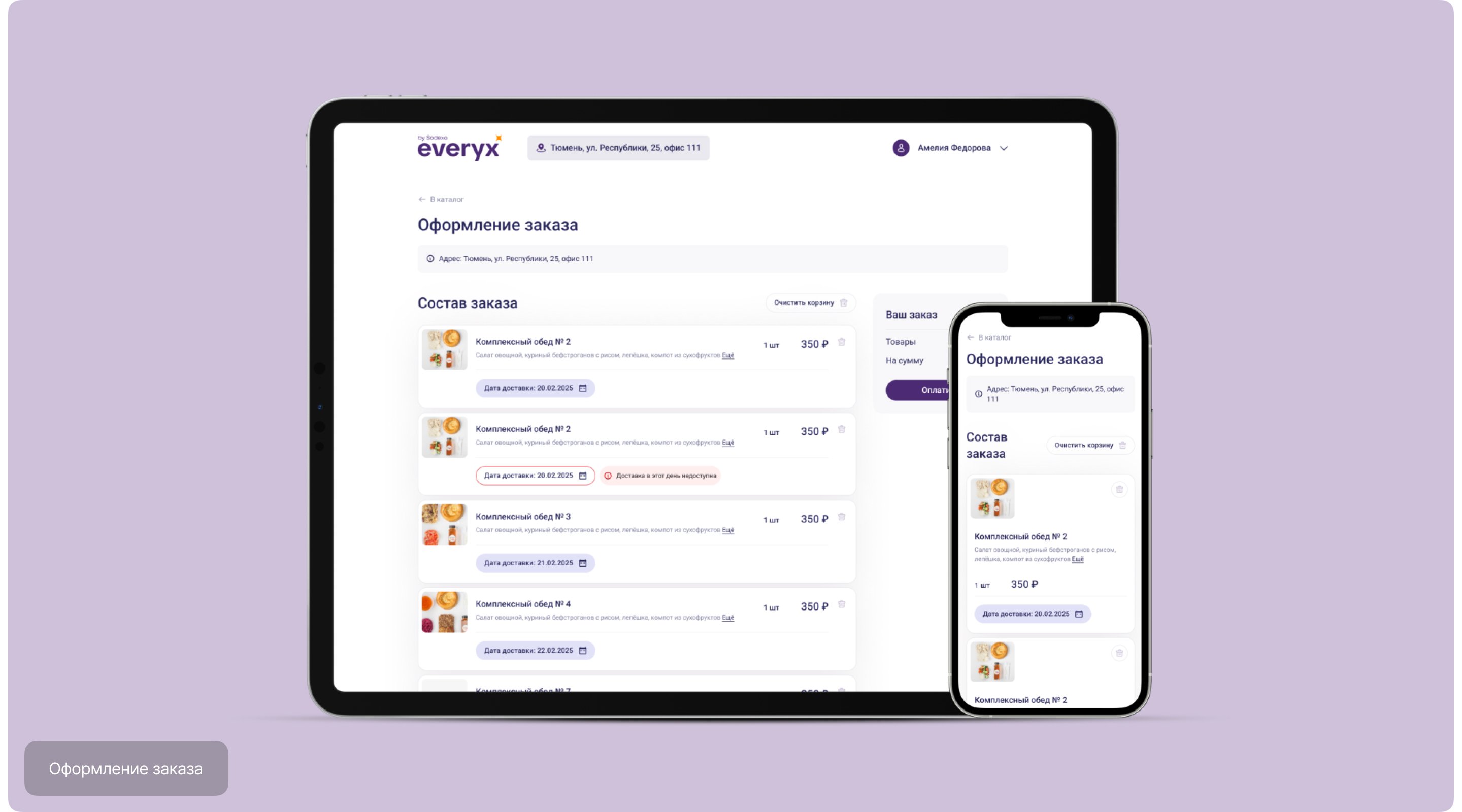 Этап оформления заказа построен так, чтобы процесс был максимально простым и прозрачным. Пользователь видит полный состав заказа с фотографиями блюд, описанием, ценой и датой доставки.