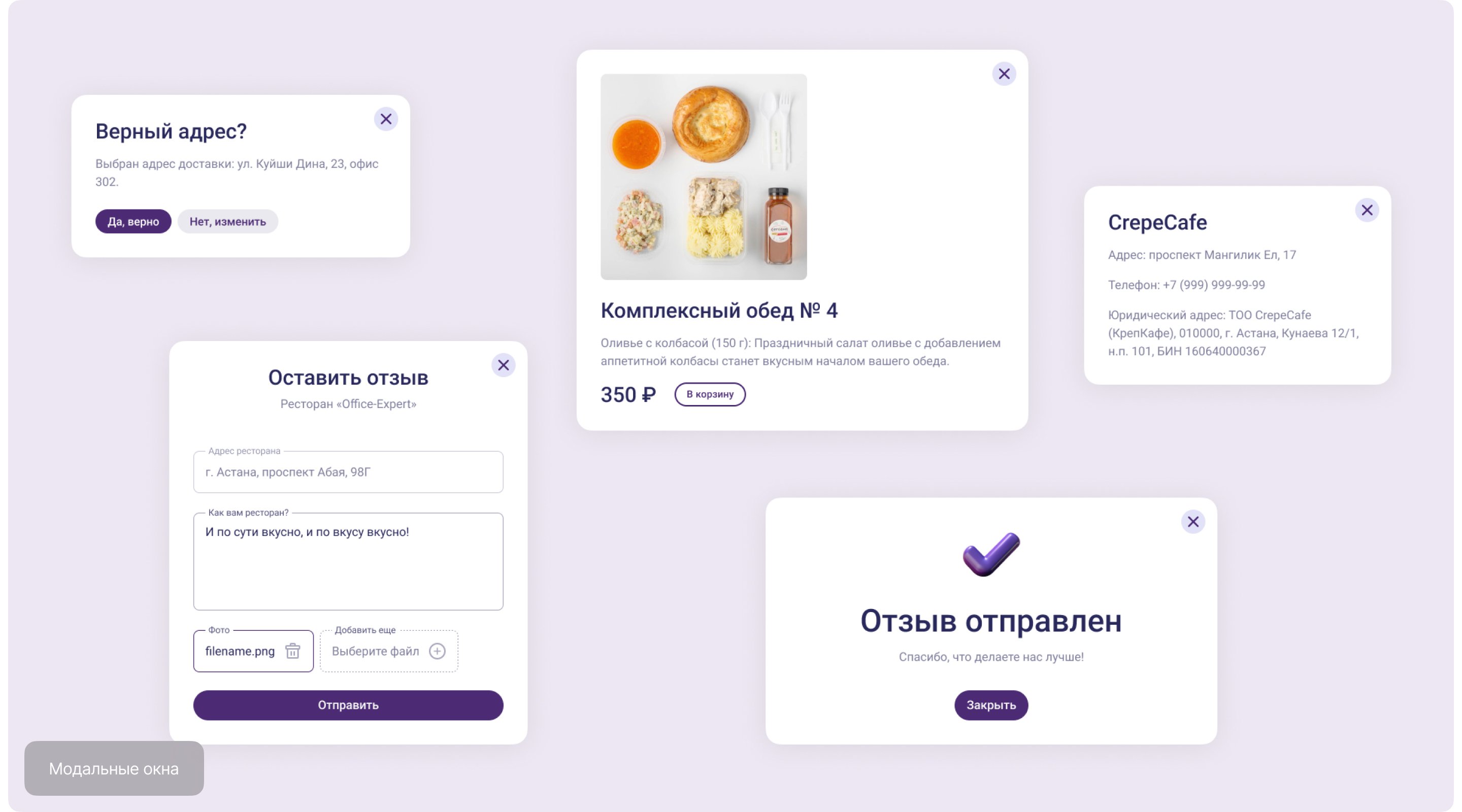 Через модальные окна можно подтвердить адрес доставки, оставить отзыв о ресторане, ознакомиться с юридической информацией заведения или просмотреть детали выбранного блюда. Данный подход экономит время и сохраняет контекст работы пользователя.