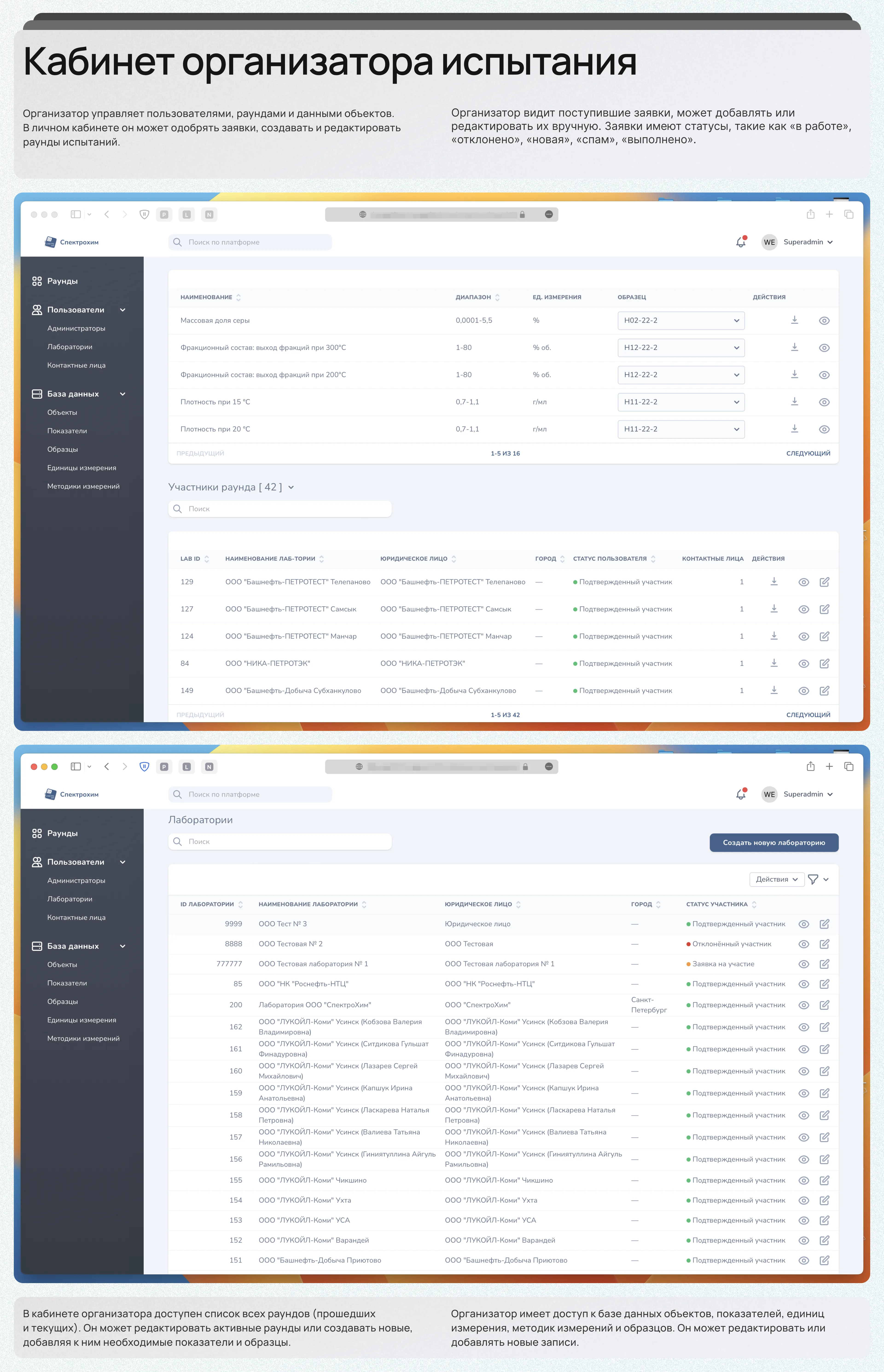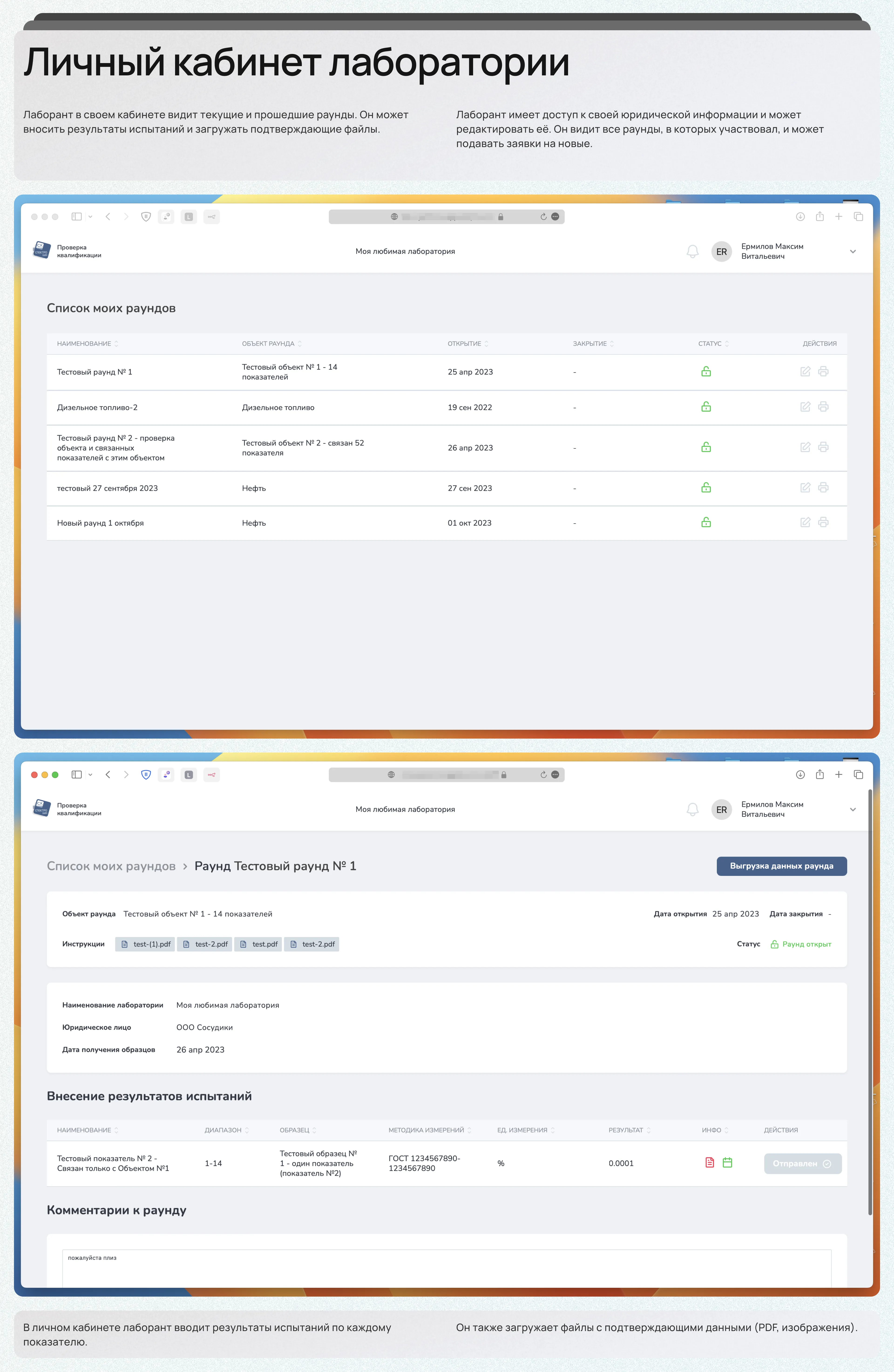 Разработать личный кабинет администратора и участника для системы проведения межлабораторных сличительных испытаний (ПК).