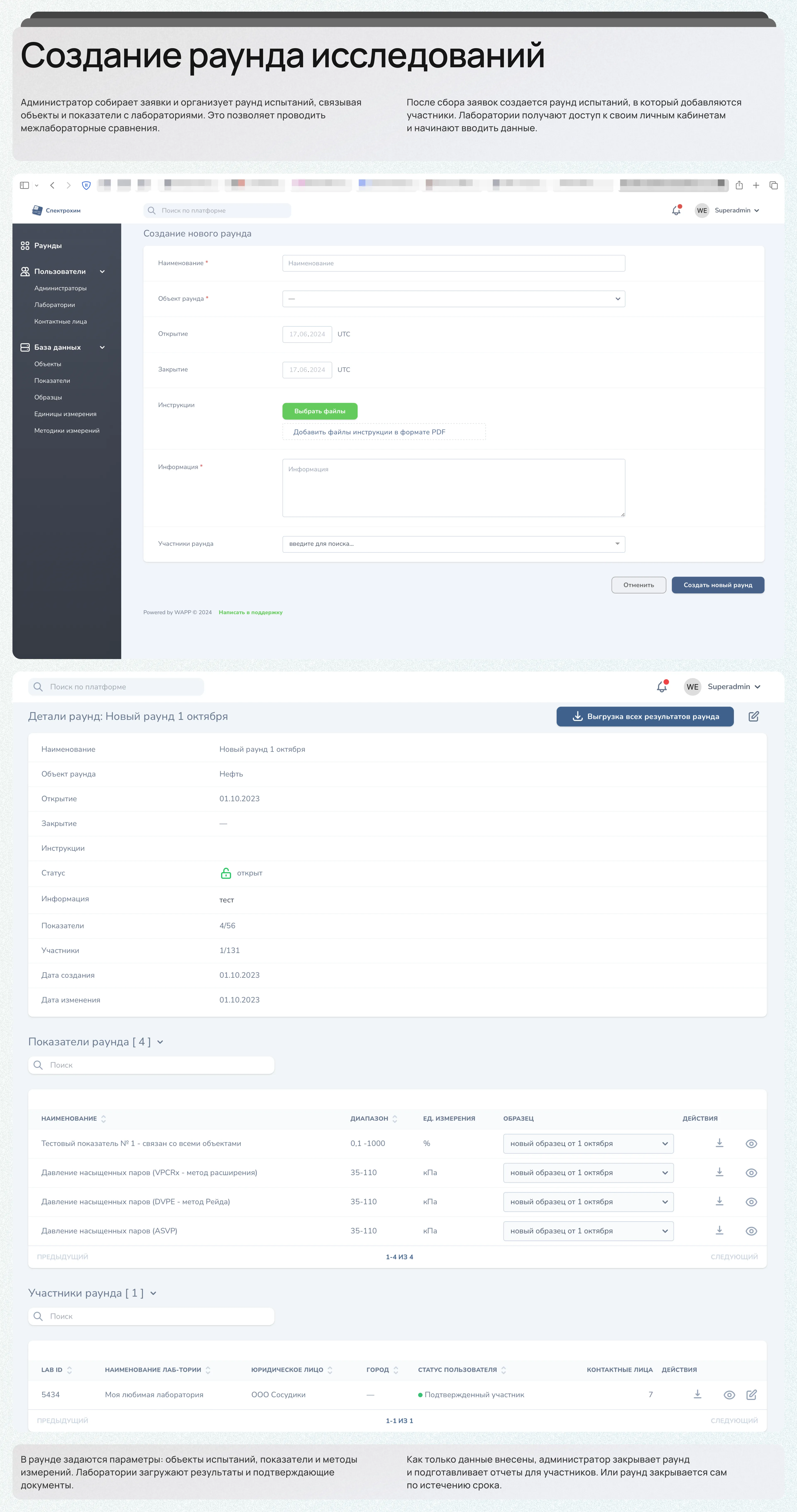 ➕ Создать интерфейс для управления раундами испытаний, включая назначение лабораторий и редактирование показателей.