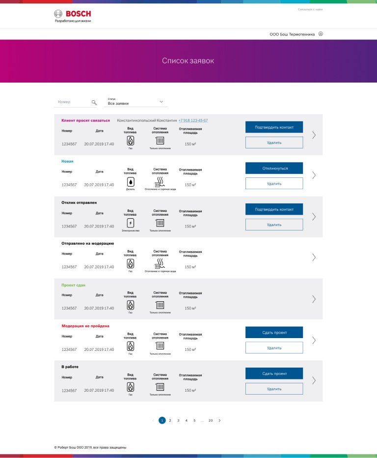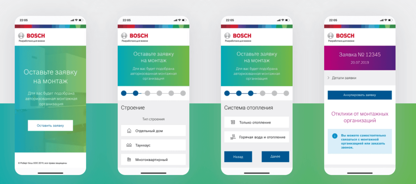 Требовалось разработать онлайн-сервис, позволяющий владельцам отопительных котлов Bosch подобрать авторизованную монтажную организацию для монтажа и пусконаладки приобретенного котла, а монтажным организациям — получить доступ к заявкам и инструмент работы с ними.