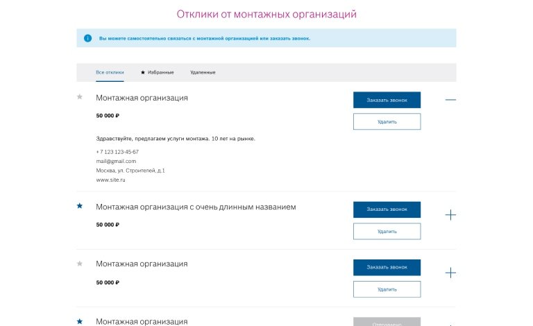 - Личный кабинет для монтажной организации, позволяющий откликаться за заявки и проводить их по воронке.