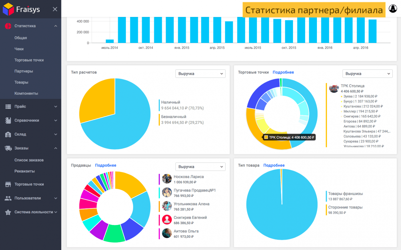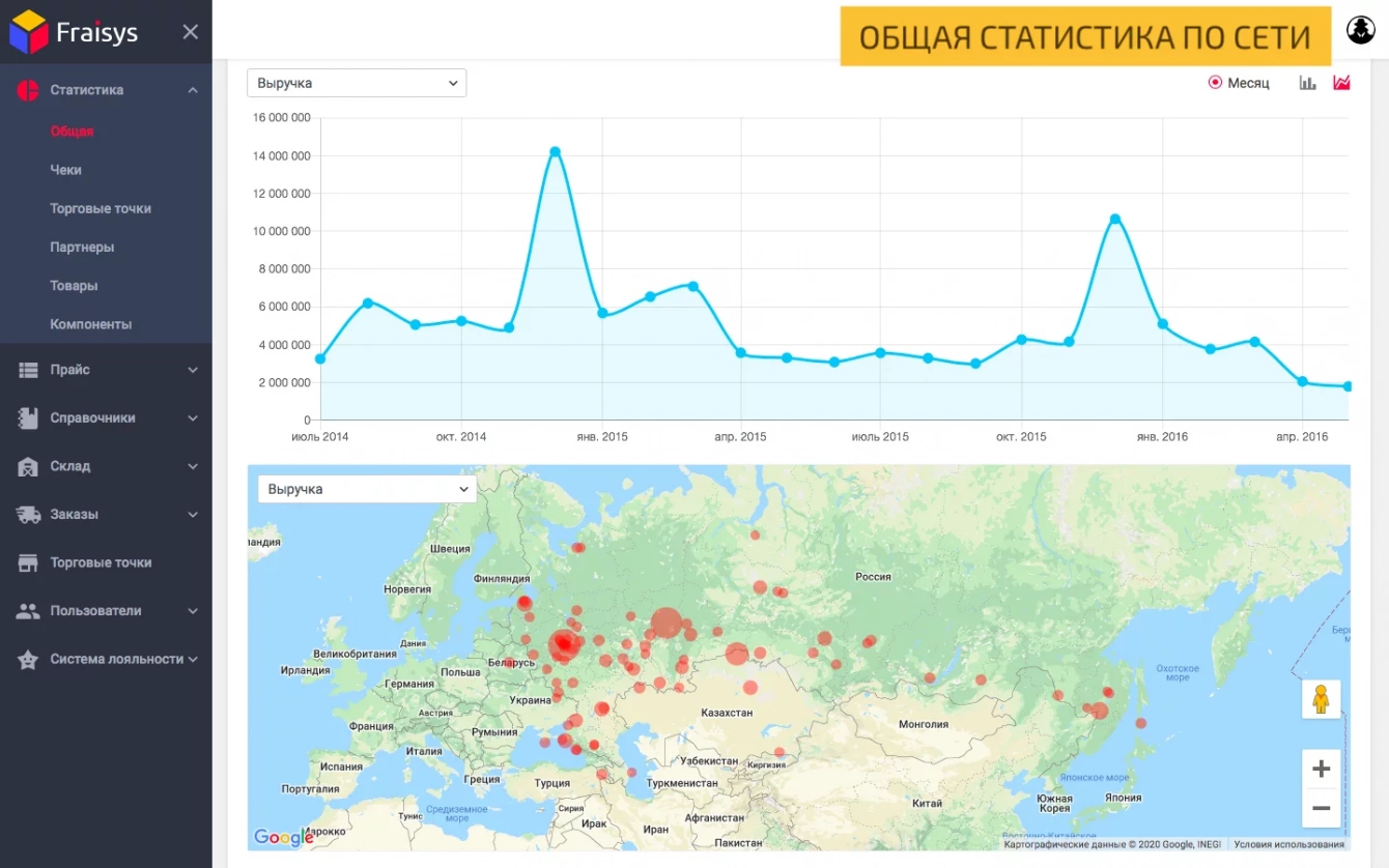 - Просмотр статистики продаж всей розничной сети в режиме реального времени.