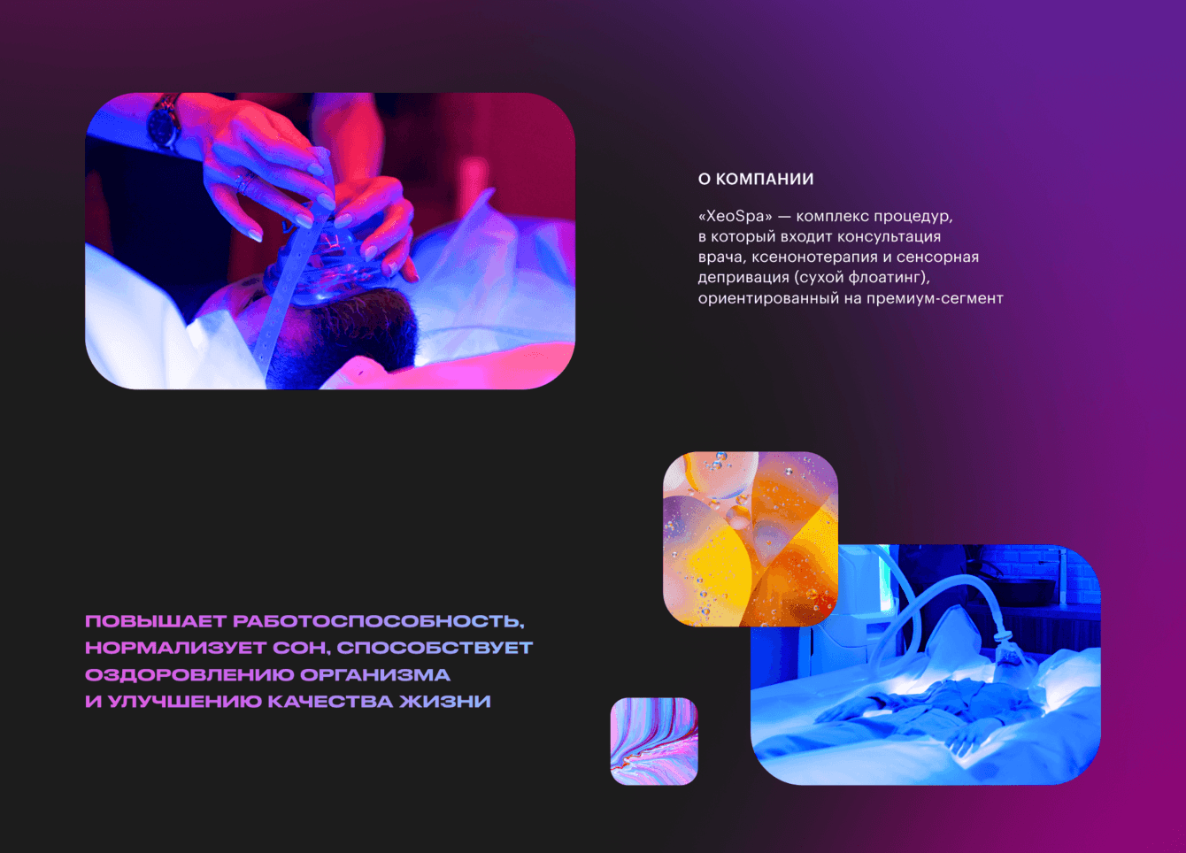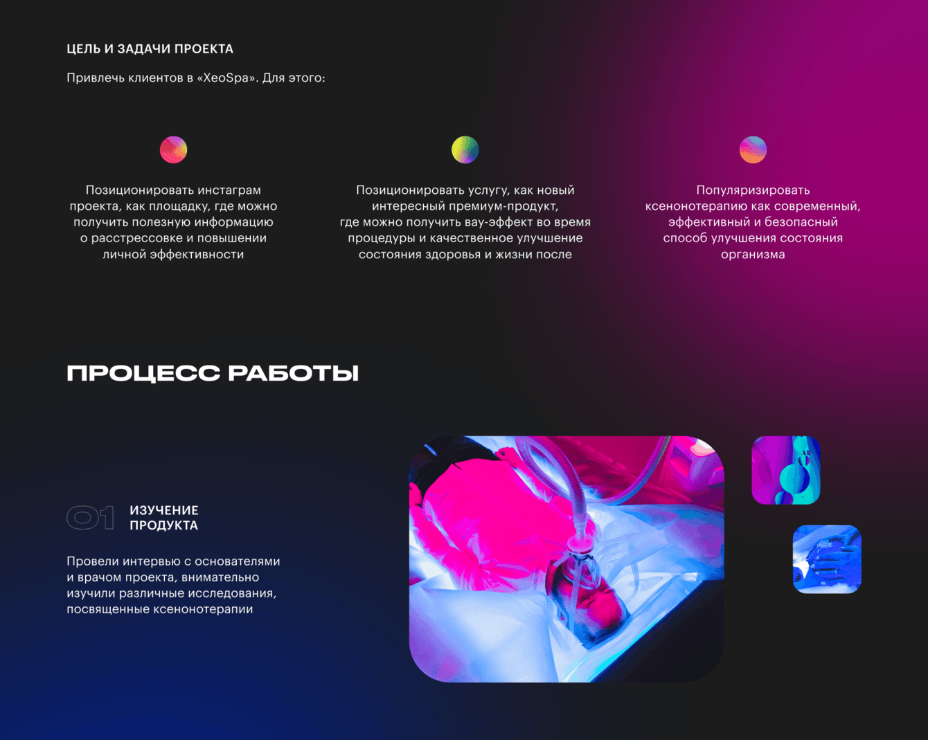 Для этого было произведено: позиционирование Instagram-проекта как площадки, где можно получить полезную информацию о расстрессовке и повышении личной эффективности; позиционирование услуги как нового интересного премиум-продукта, где можно получить вау-эффект во время процедуры и качественное улучшение состояния здоровья и жизни после; популяризация ксенонотерапии как современного, эффективного и безопасного способ улучшения состояния организма.