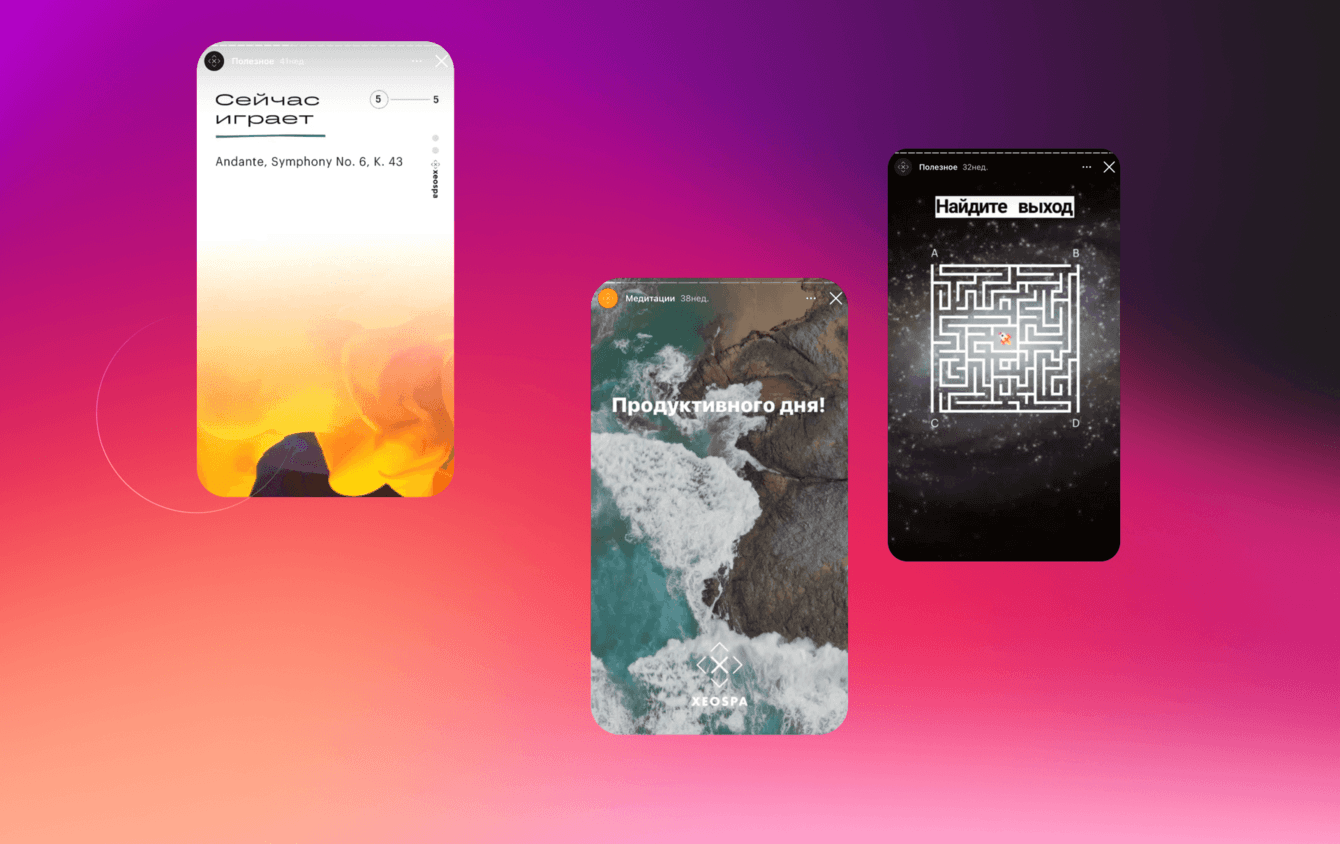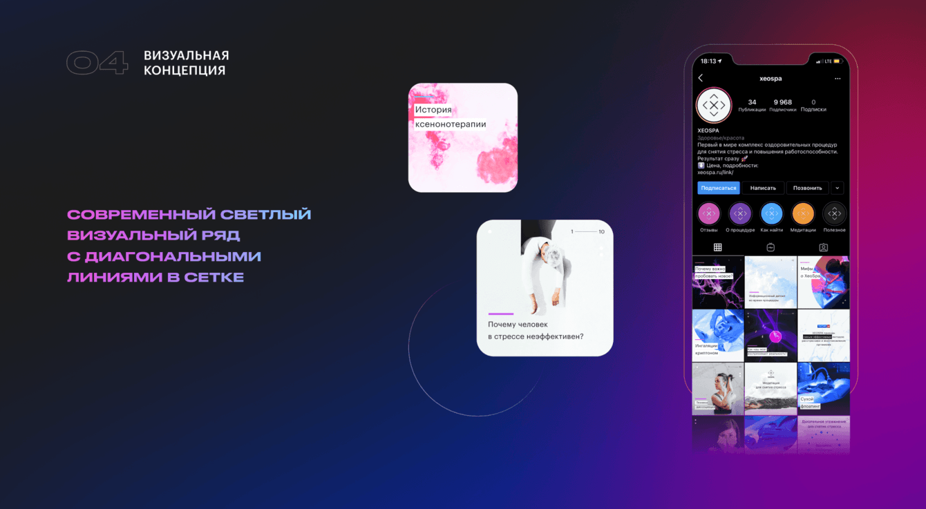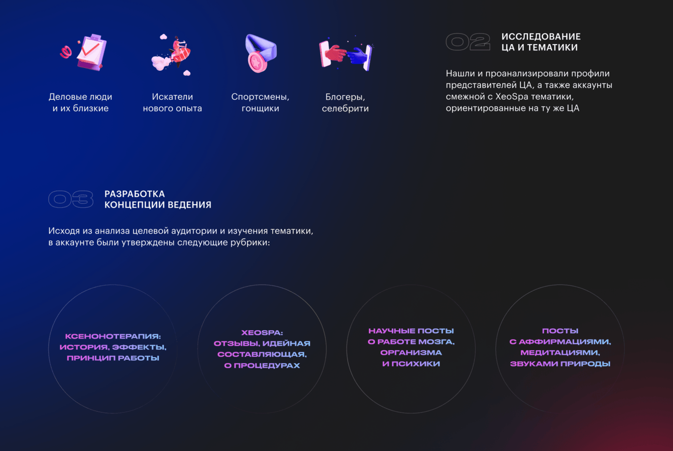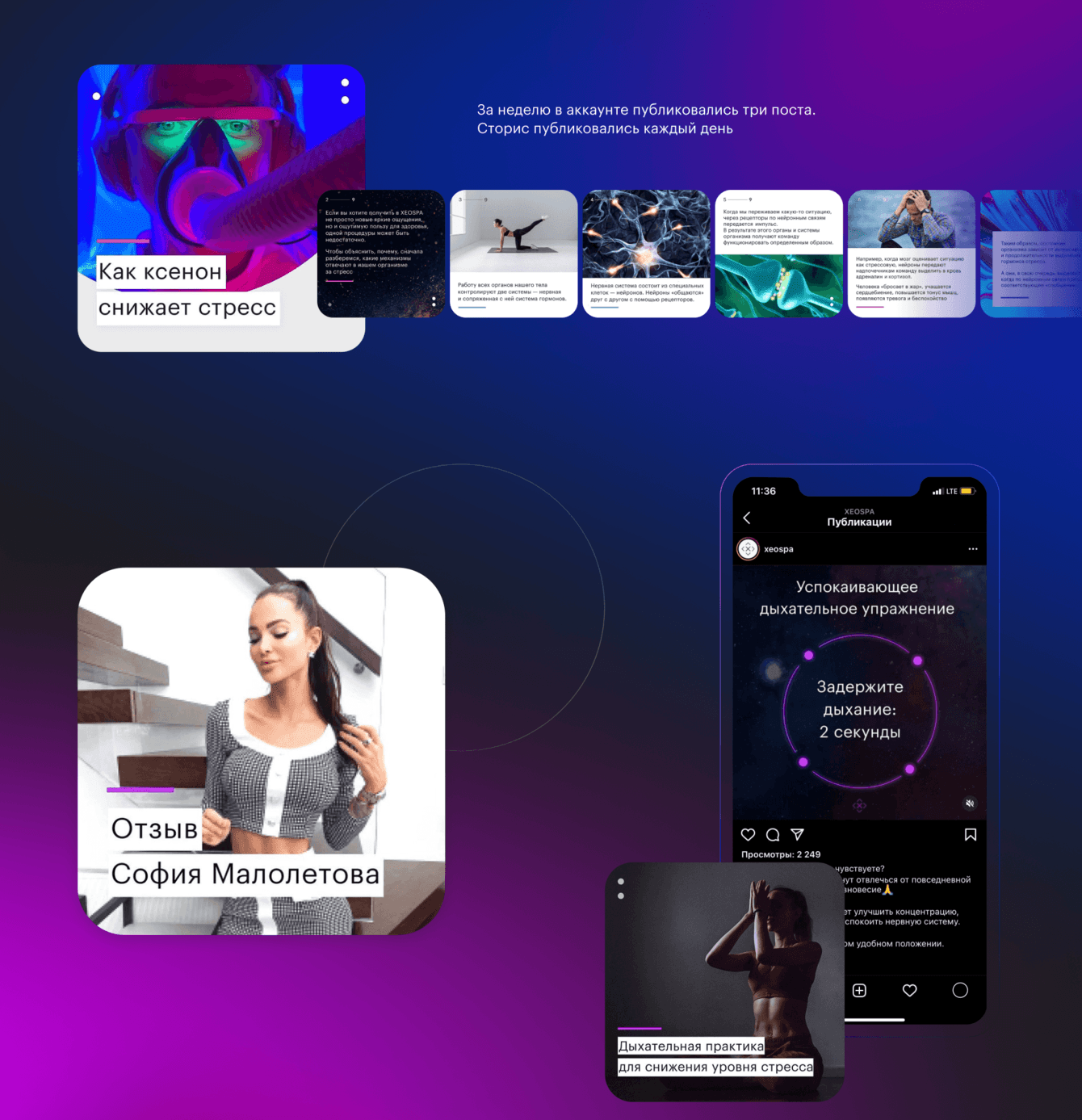 Исходя из анализа целевой аудитории и изучения тематики, в аккаунте были разработаны и утверждены следующие рубрики: ксенонотерапия — история, эффекты, принцип работы; xeospa — отзывы, идейная составляющая, о процедурах; научные посты о работе мозга, организма и психики; посты с аффирмациями, медитациями, звуками природы.