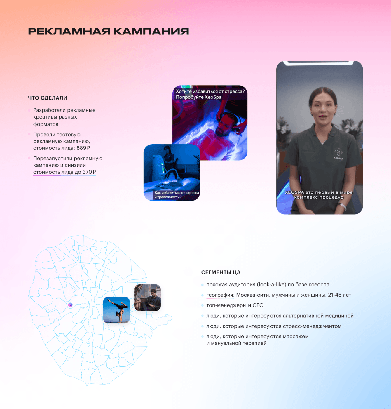 Что сделали: разработали рекламные креативы разных форматов , провели тестовую рекламную кампанию, стоимость лида: 889₽, перезапустили рекламную кампанию и снизили стоимость лида до 370₽.