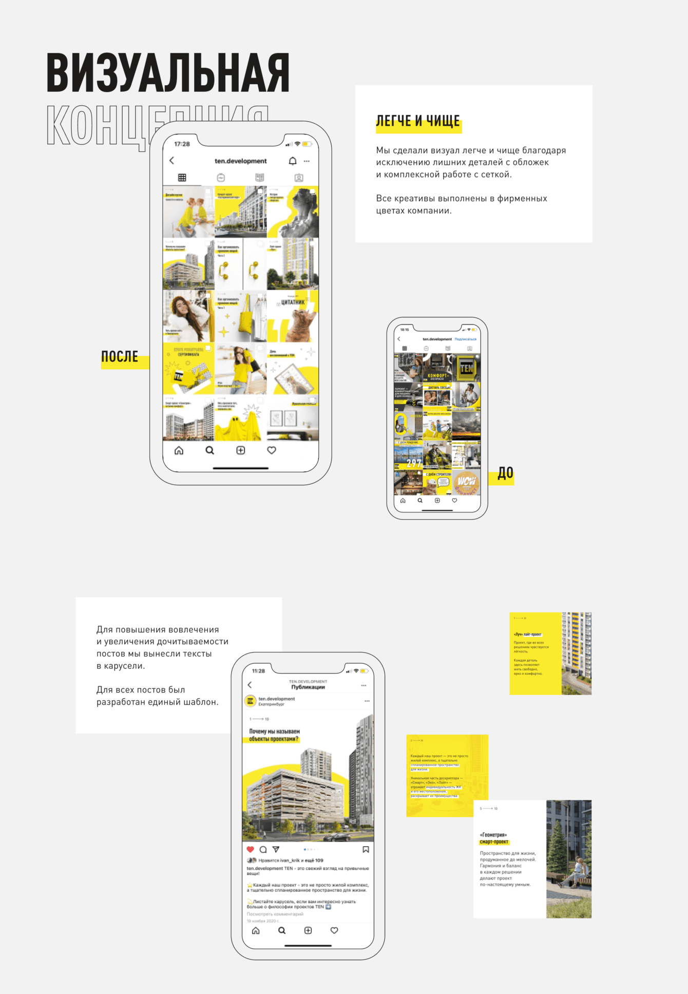 В результате был сформирован оптимальный набор рубрик, изменена визуальная концепция и тональность текстов в аккаунте. Мы сделали визуал легче и чище благодаря исключению лишних деталей с обложек и комплексной работе с сеткой. Все креативы выполнены в фирменных цветах компании.