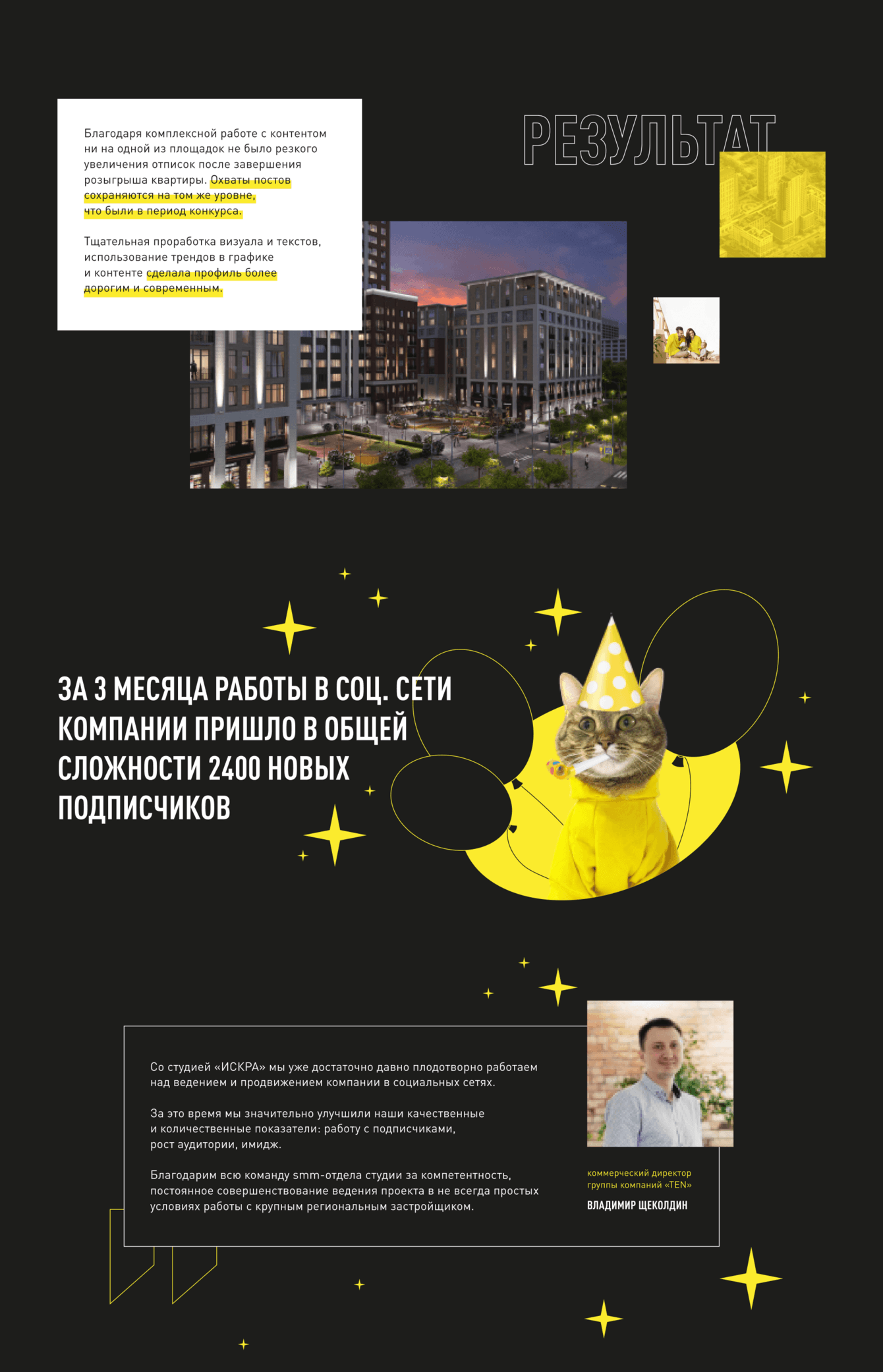 Благодарим всю команду smm-отдела студии за компетентность, постоянное совершенствование ведения проекта в не всегда простых условиях работы с крупным региональным застройщиком.![]()