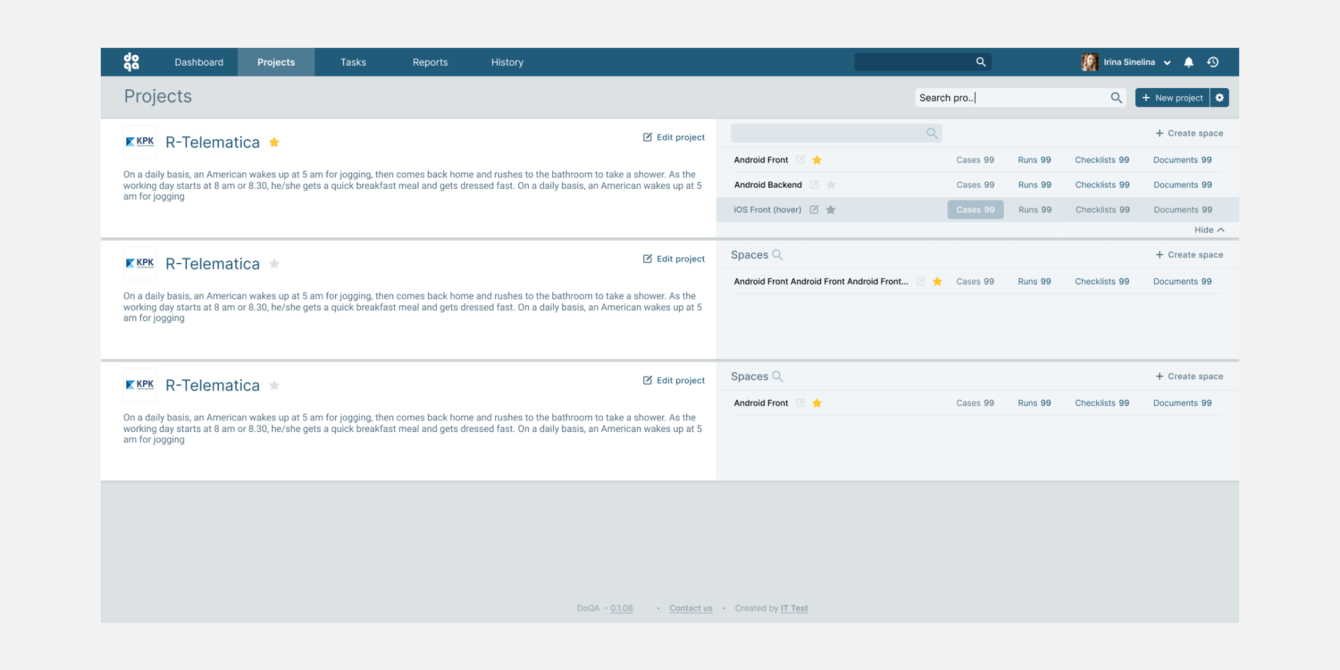 Концепция TMS DoQA зародилась в конце 2018 года, и уже к началу 2019-го мы создали MVP. За основу взята работа команды IT Test из более 70 опытных тестировщиков, столкнувшихся с недостатками существующих TMS и платформ управления проектами. Создавая DoQA, мы организовали фокус-группу из коллег для определения функционала и дизайна UX/UI, полагаясь на их профессиональный опыт.