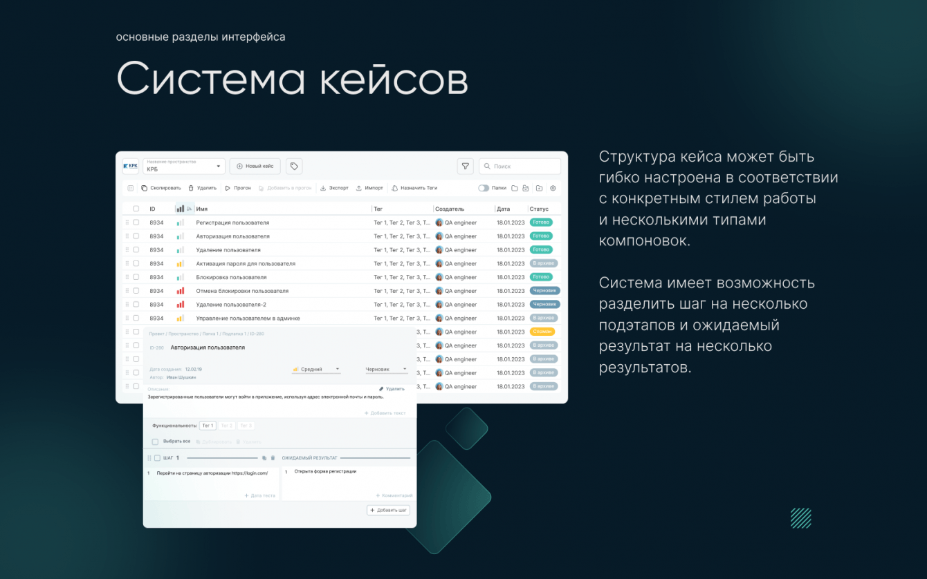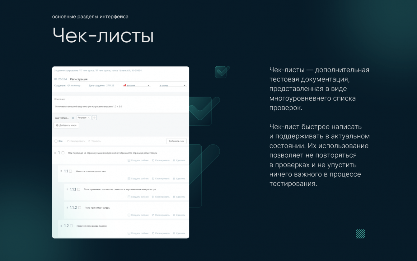 ● поддерживает работу не только с тест-кейсами, но и с чек-листами;