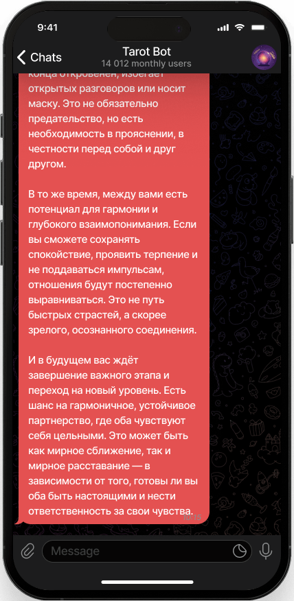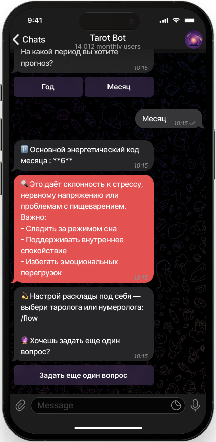 Мы создали Telegram-бота, который не просто выдаёт прогнозы, а будто садится с тобой за стол, раскладывает карты и говорит: «Слушай, вот что звёзды тебе шепчут». Пользователи в восторге — пишут, что бот «знает их лучше, чем они сами», и возвращаются за новыми раскладами. Один даже сказал: «Я как будто с подругой-гадалкой чатюсь!»