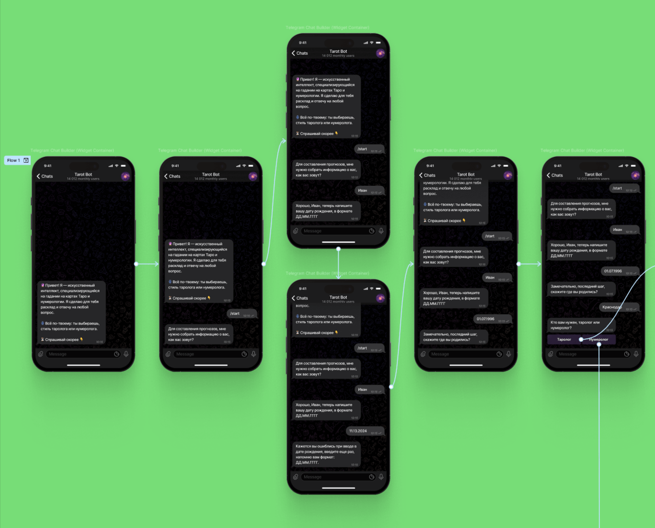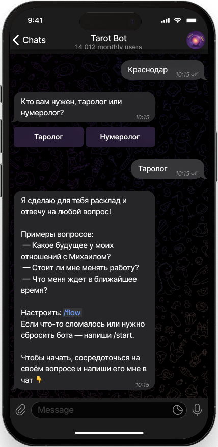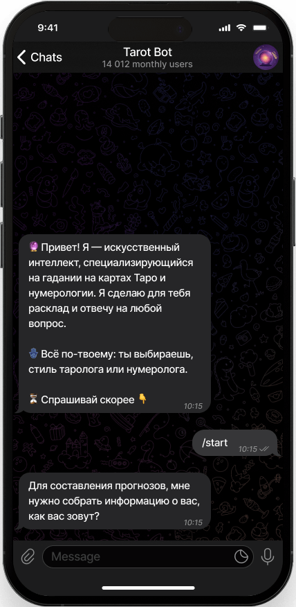 Сели с заказчиком в Telegram, и он начал рассказывать: «Хочу, чтобы люди чувствовали, будто с ними говорит настоящий таролог, чтобы было личное, с душой». Мы расспрашивали: какая атмосфера? Как гадалка в шатре или современный вайб? Обсудили, как человек будет заходить в бот, выбирать расклад, платить подписку. Он так воодушевлённо говорил, что мы сами загорелись.