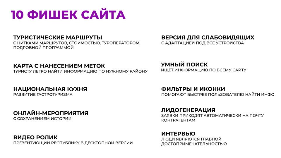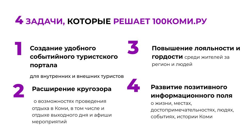 Основная задача: Создать Web-продукт, с помощью которого гости и жители региона смогут узнать о республике, ее людях и достопримечательностях, выбирать туристические маршруты, гостиницы и мероприятия.