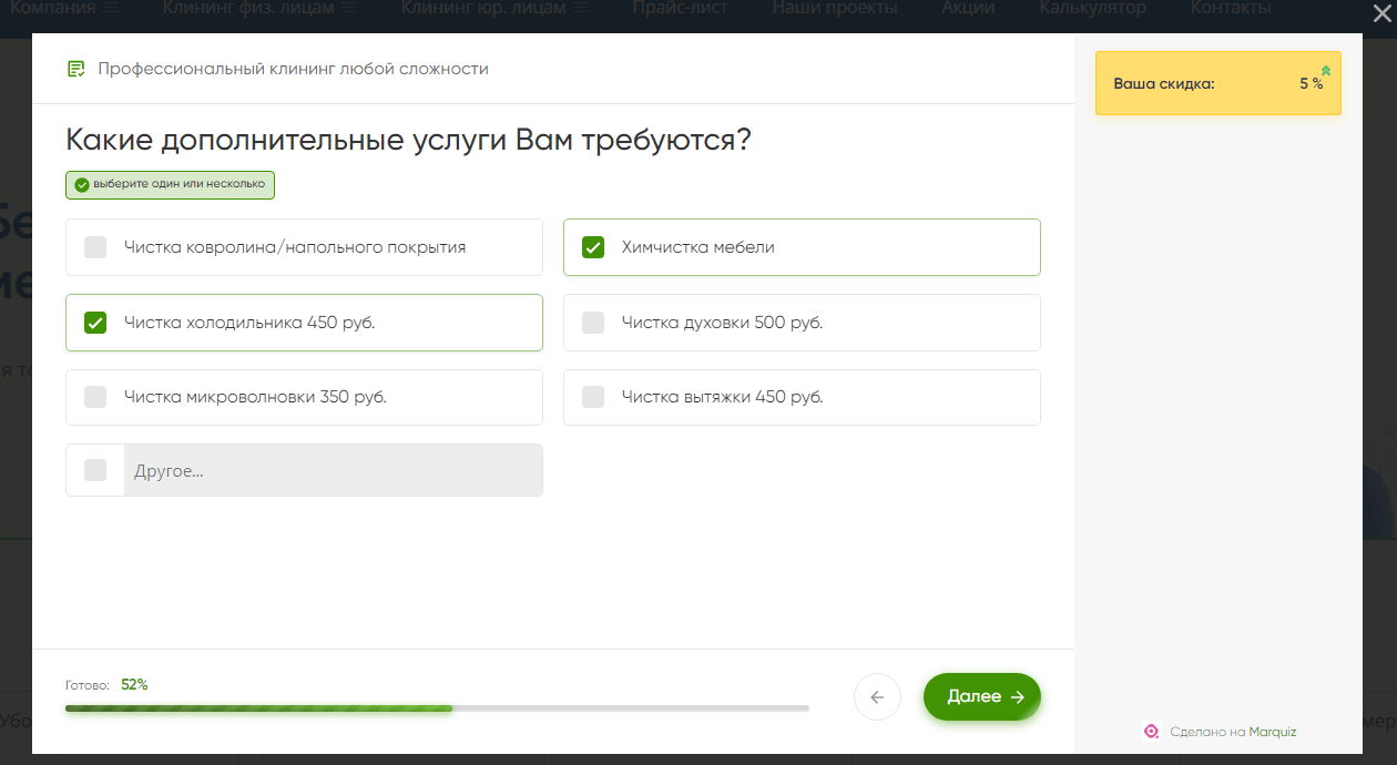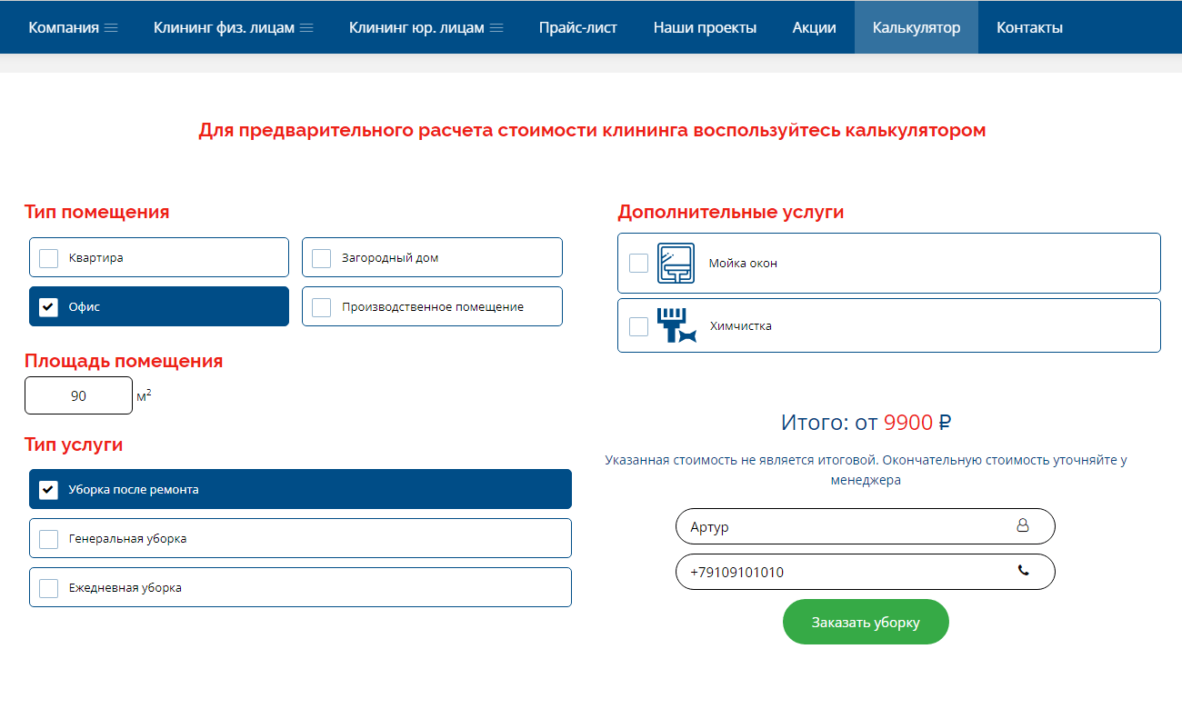 3. Добавить на сайт калькулятор уборки.