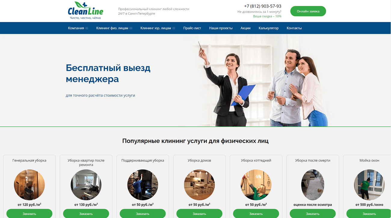 Форма собирает контактные данные клиентов и при этом экономит их время. Если у посетителя сайта нет времени читать описание услуги и вникать в тонкости расчета, нужно просто указать свои имя и номер телефона в специальной форме. Менеджер компании Clean Line перезвонит и расскажет всё, что интересует клиента.