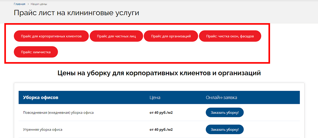 У компании CleanLine обширный прайс-лист. Чтобы посетитель тратил меньше времени на поиск нужной информации, мы добавили в прайс фильтры по самым популярным направлениям услуг.