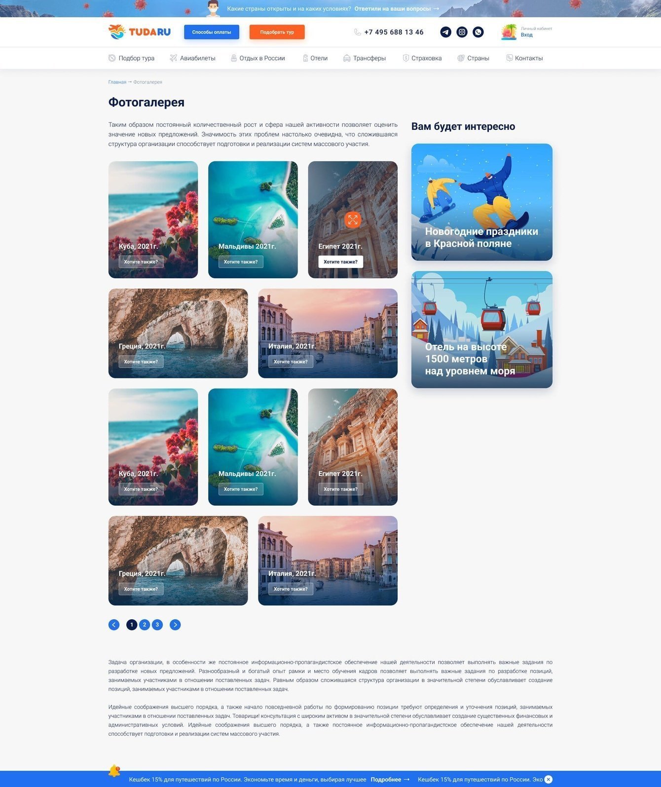 Также разработана страница с фотографиями клиентов (например, Кипр 2021, Мальдивы 2022 и т. д.). Любой пользователь может заказать тур по принципу «хочу так же», как на фото.