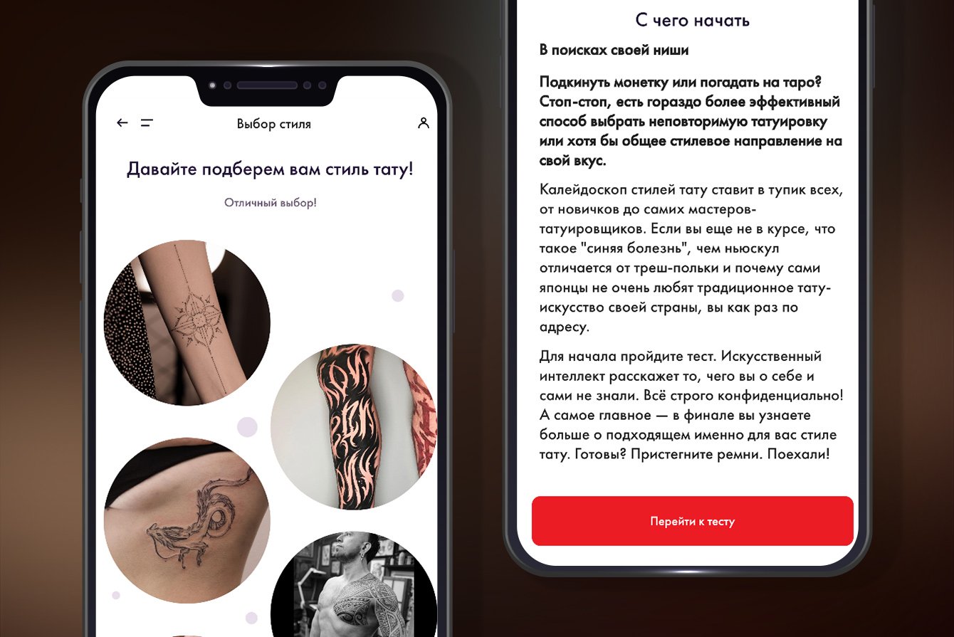 Бо́льшая часть наших усилий была направлена на создание понятного и эффективного алгоритма, который поможет пользователю легко определиться со стилем тату, местом нанесения рисунка и, в итоге, найти подходящего мастера. Одним из самых эффективных инструментов для этого стал интерактивный тест, который позволяет выбрать несколько понравившихся вариантов тату, после чего система определяет, какой стиль подходит именно этому пользователю, и рекомендует тату-мастеров поблизости.