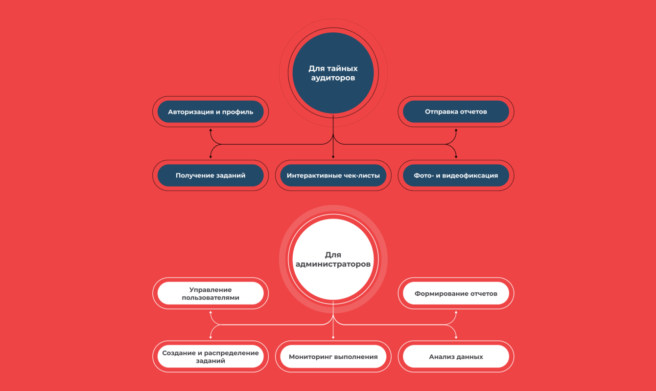 - Разработка функционала для тайных покупателей: личный кабинет, получение заданий, интерактивные чек-листы, опция фото- и видеофиксации, отправка отчетов.