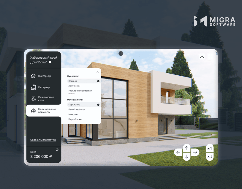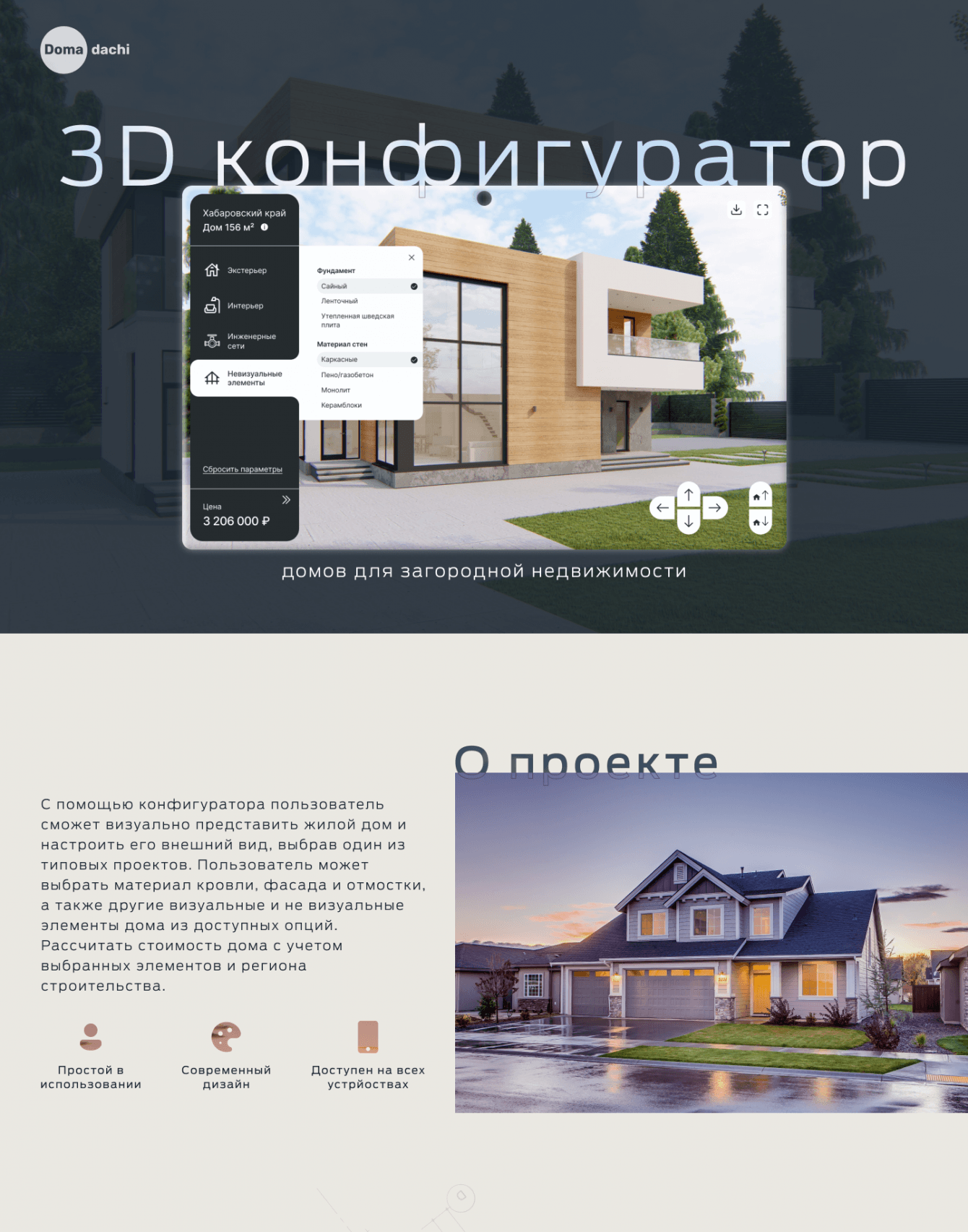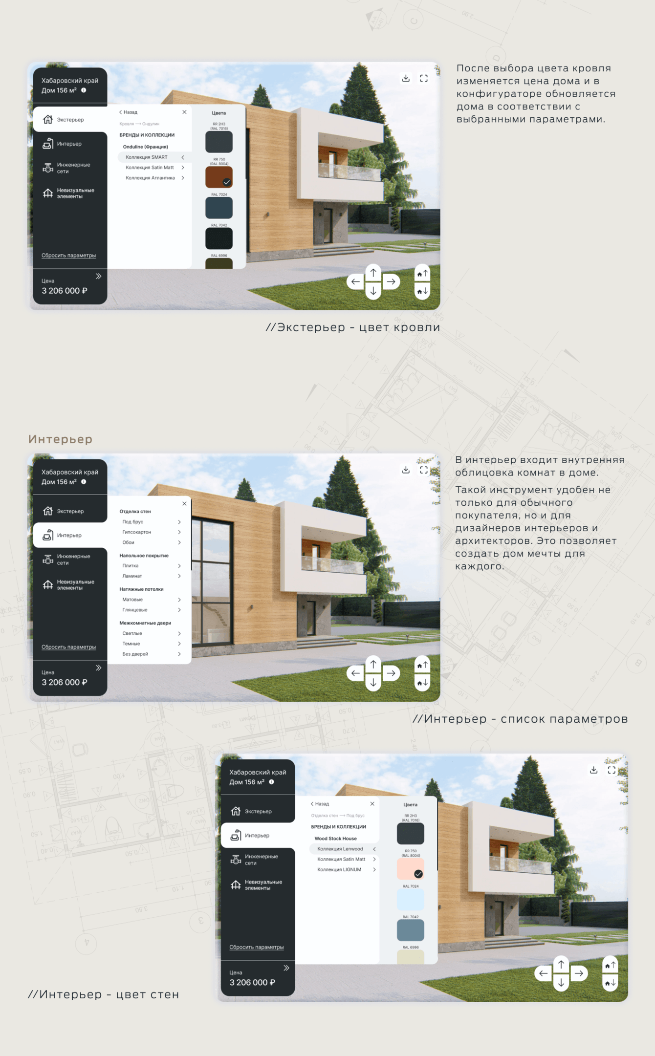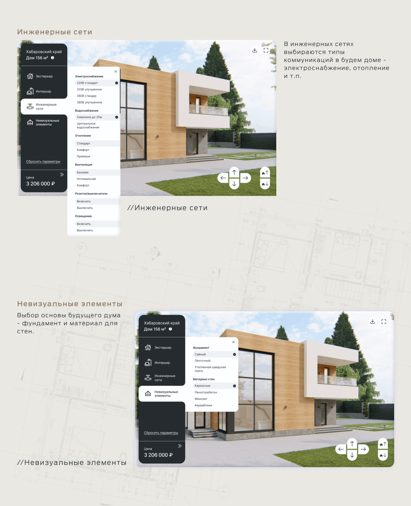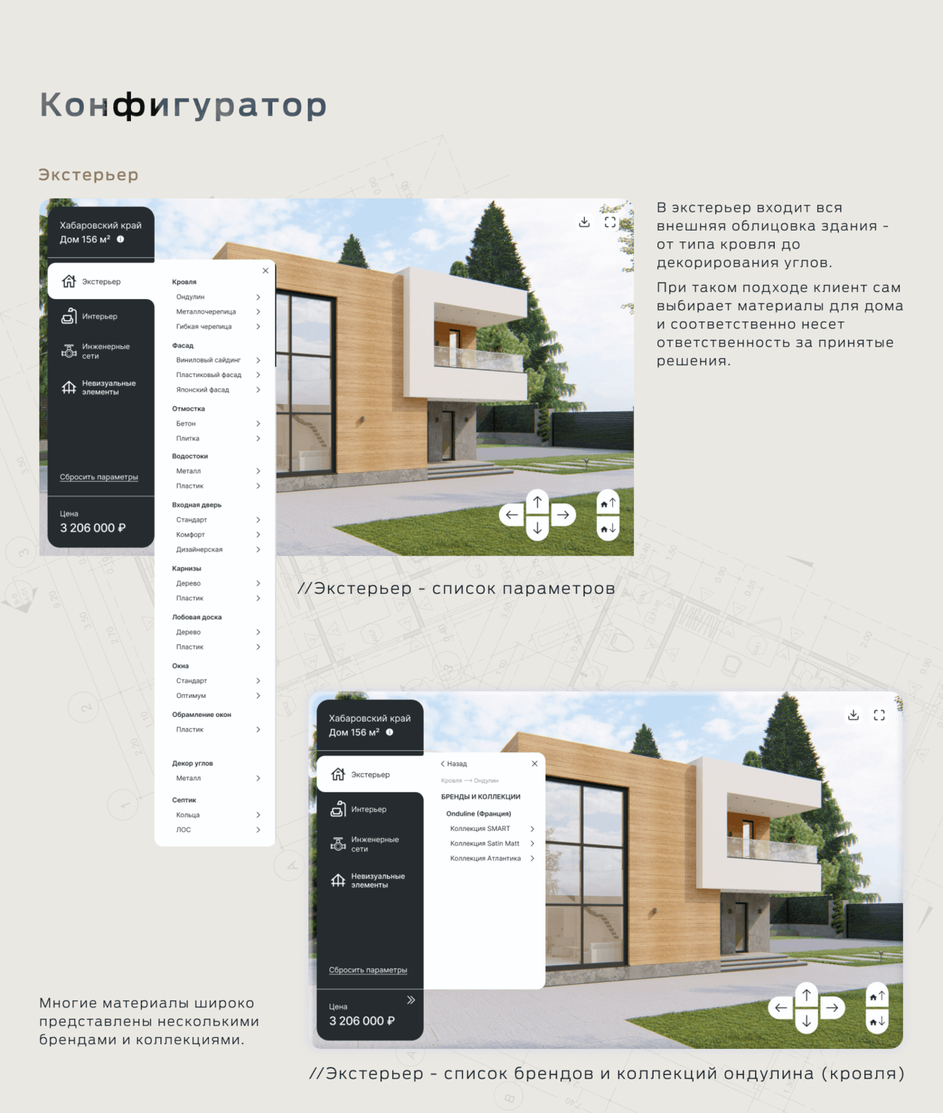 Обеспечить выбор из доступных опций визуальных и невизуальных элементов дома, таких как материал кровли, фасада, отмостки. водосточной системы и др.