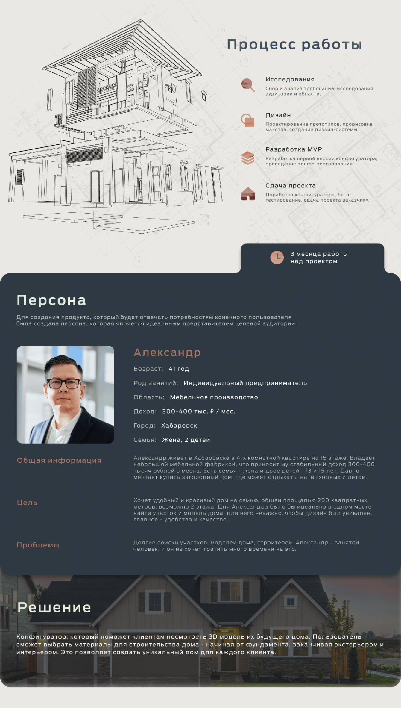 Обеспечить сохранение и передачу выбранной пользователем конфигурации для дальнейшего взаимодействия с ним отдела продаж и дальнейшего заказа услуг по строительству.