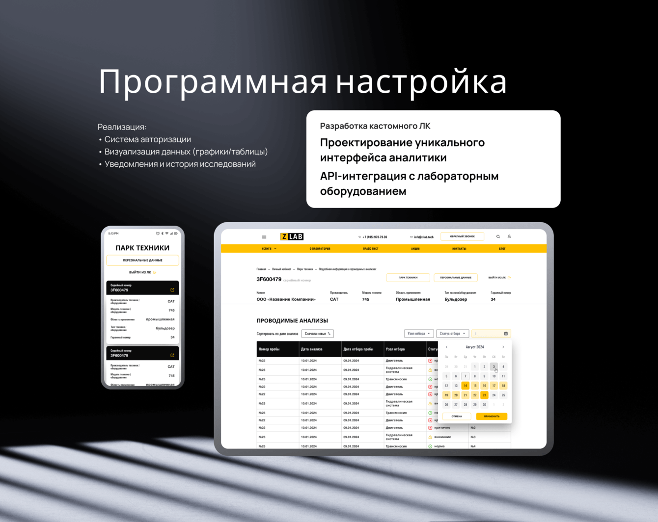 • Интеграция техники и проводимых проб из 1с, обновление данных.