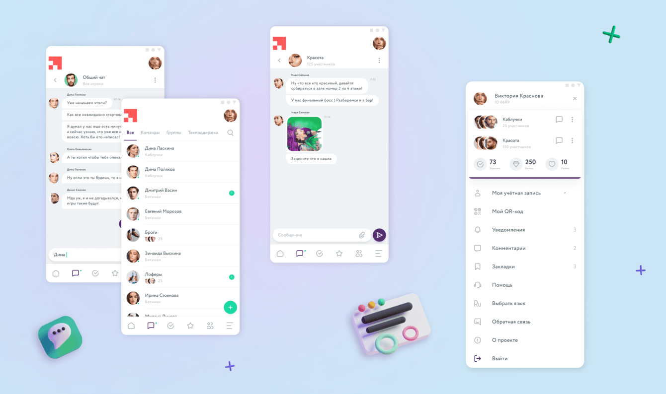 Для коммуникации пользователей есть общие и командные чаты, а для отслеживания собственного прогресса — личный кабинет, где собрана вся информация о начисленных баллах и бонусах, как за игру, так и за социальную активность.