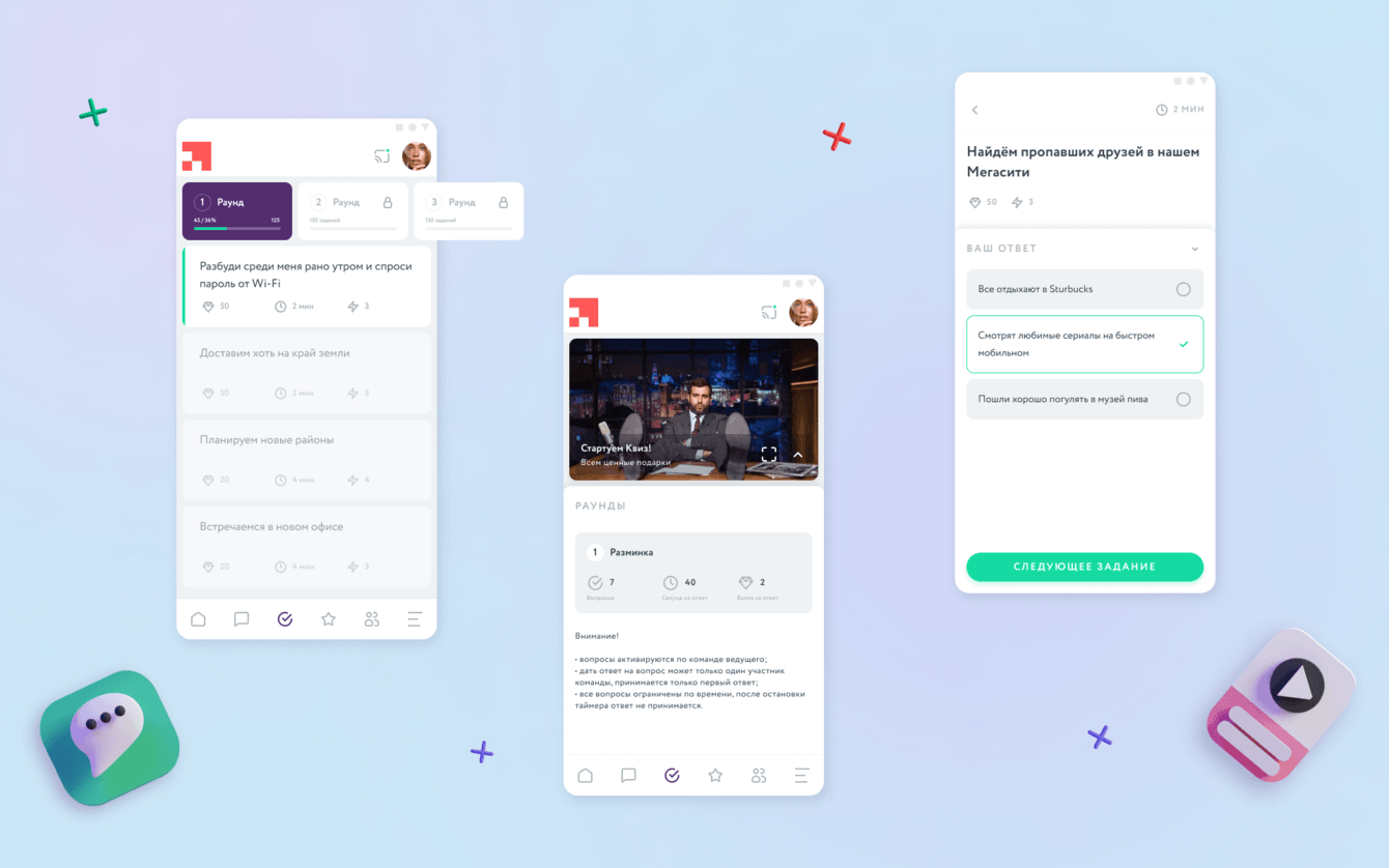 Игровой модуль поддерживает 2 вида игр: квестовые, когда пользователи проходят задания в удобное для каждого из них время, и квизовые, когда все участники в режиме онлайн отвечают на вопросы по команде ведущего за отведённое для этого время.
