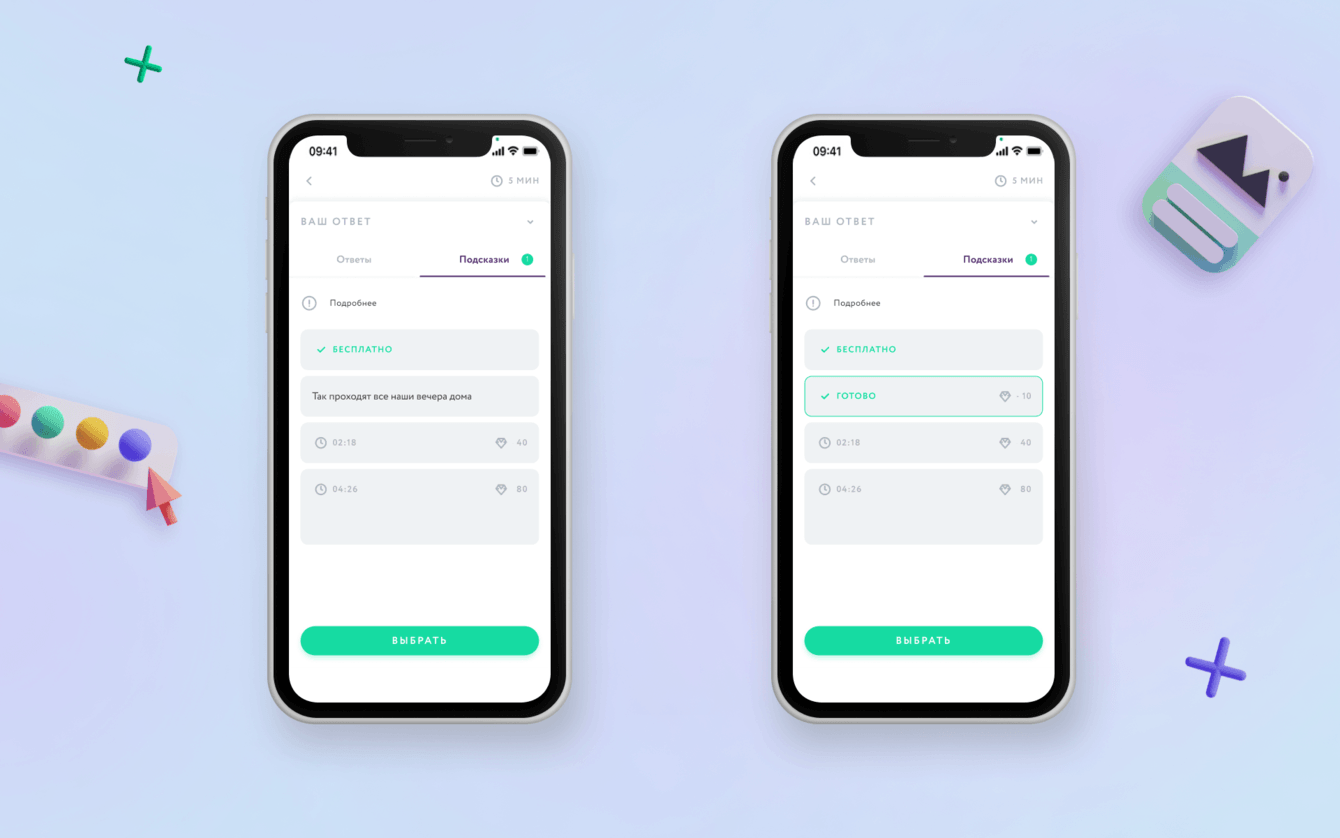 В заданиях могут быть подсказки, каждая из которых имеет определённую стоимость в баллах. Подсказок к заданию может быть несколько, каждая активируется через заданный промежуток времени.