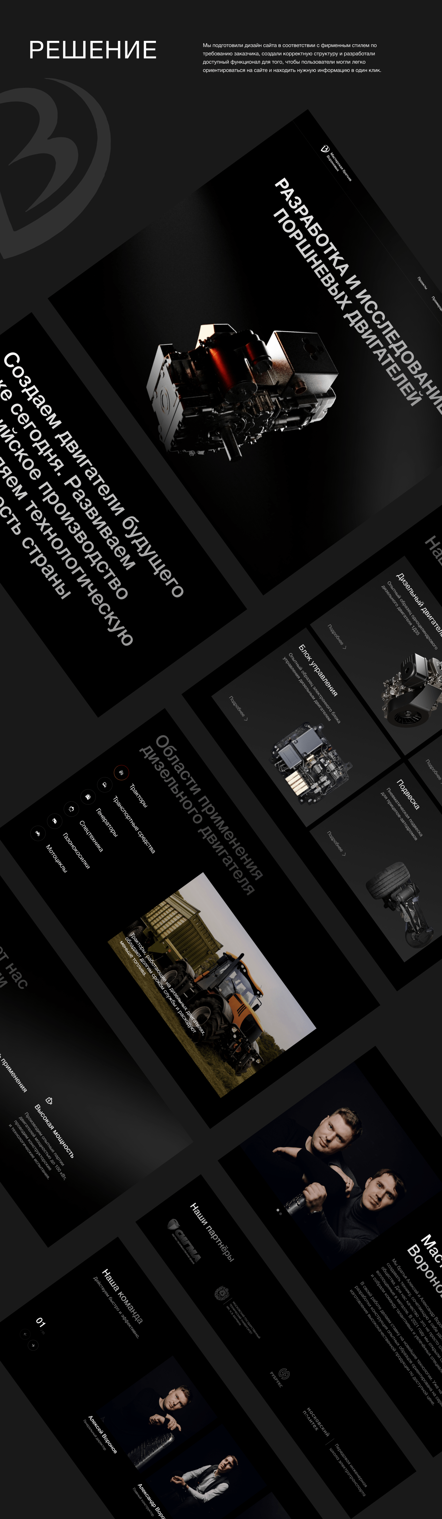 3D-визуализация и Motion Design: Мы разработали уникальную 3D-анимацию процесса сборки двигателя для первого экрана. Это создало «вау-эффект» и мгновенно вовлекло посетителя в изучение продукта.