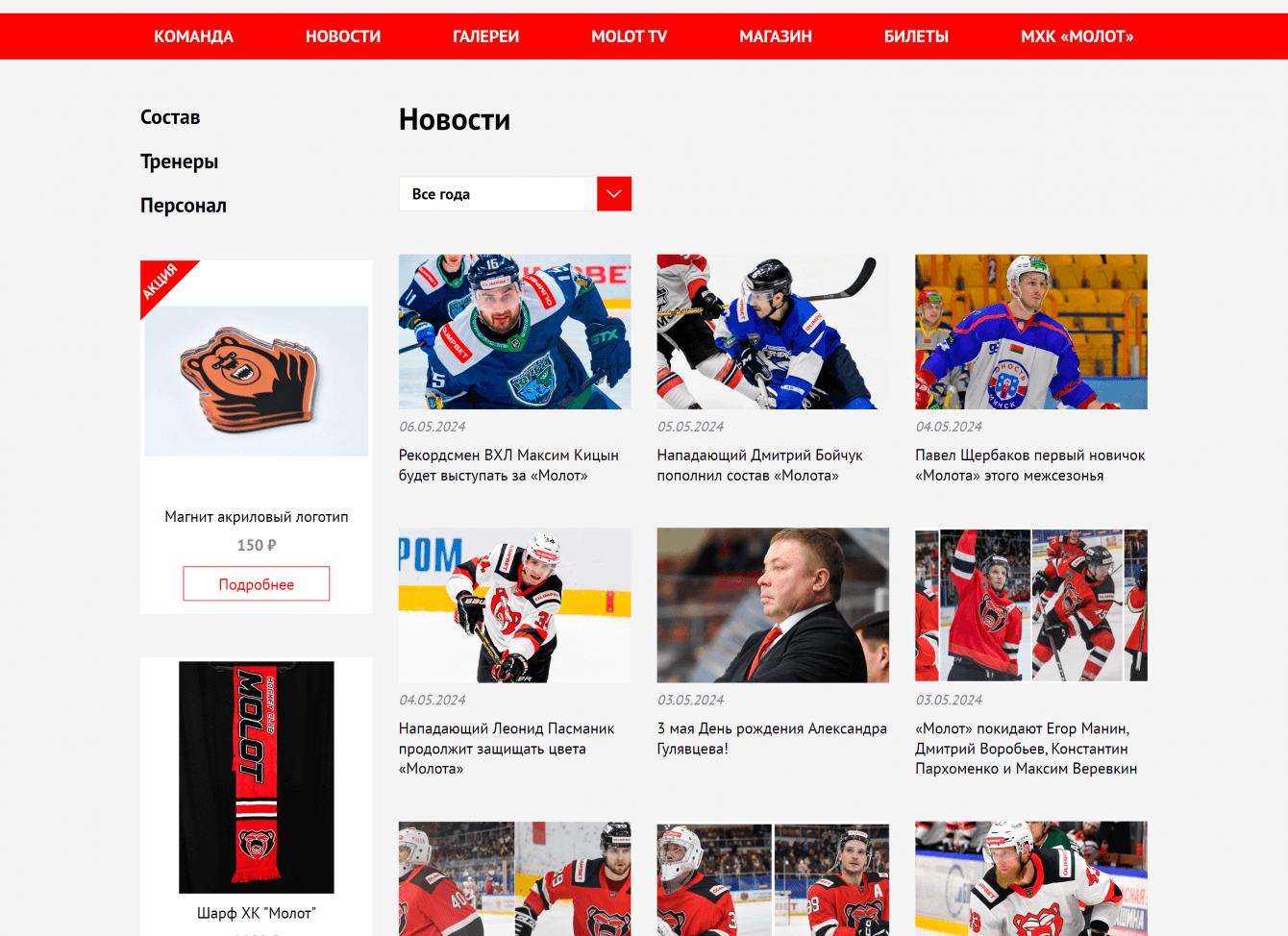 К нам обратился местный хоккейный клуб "Молот" с запросом создания нового сайта. Мы отнеслись к его разработке с теплотой и глубоким энтузиазмом. Многие наши сотрудники любят спорт и являются патриотами своего города. Однако в процессе работы нам пришлось досконально изучить многие хоккейные нюансы, в том числе системы начисления очков. Более того, после разработки мы неоднократно посещали матчи клуба. Ибо когда мы занимаемся проектом, мы погружаемся во все аспекты деятельности клиента, чтобы прочувствовать атмосферу и узнать все специфичные тонкости