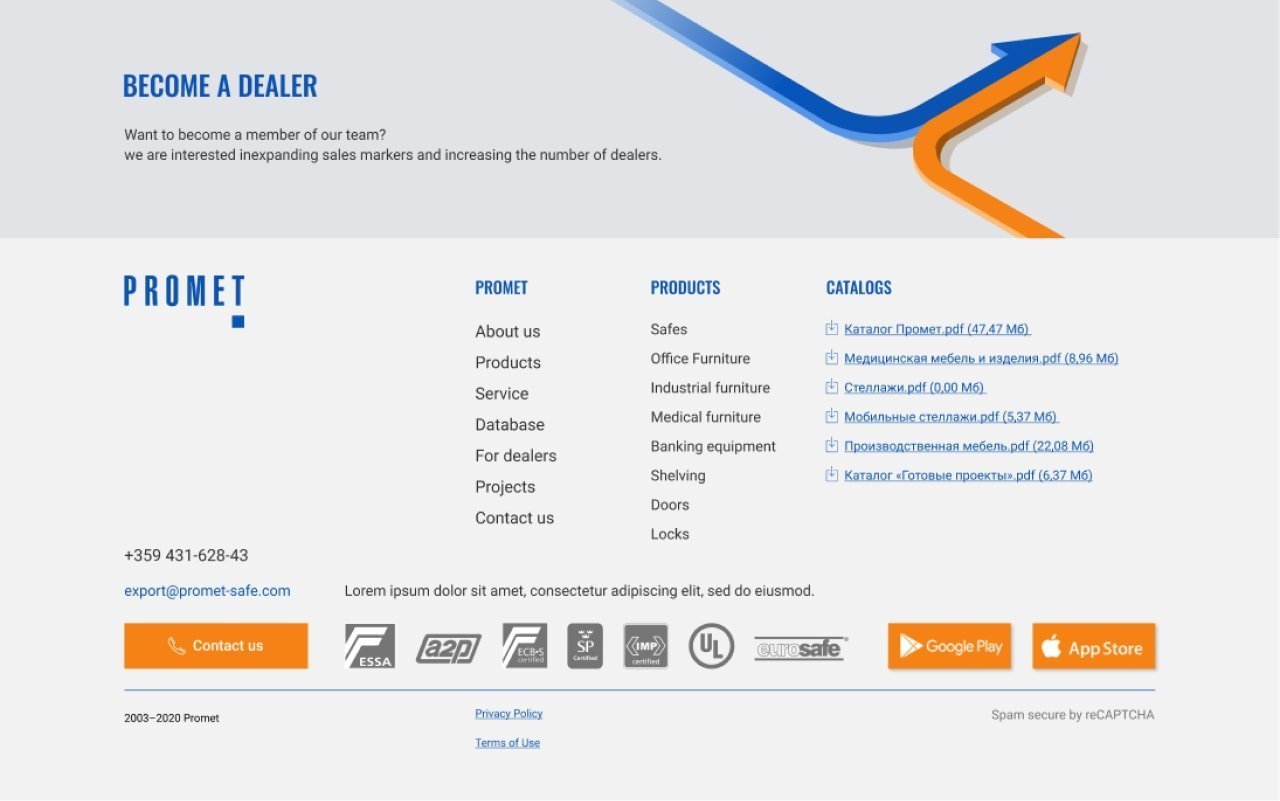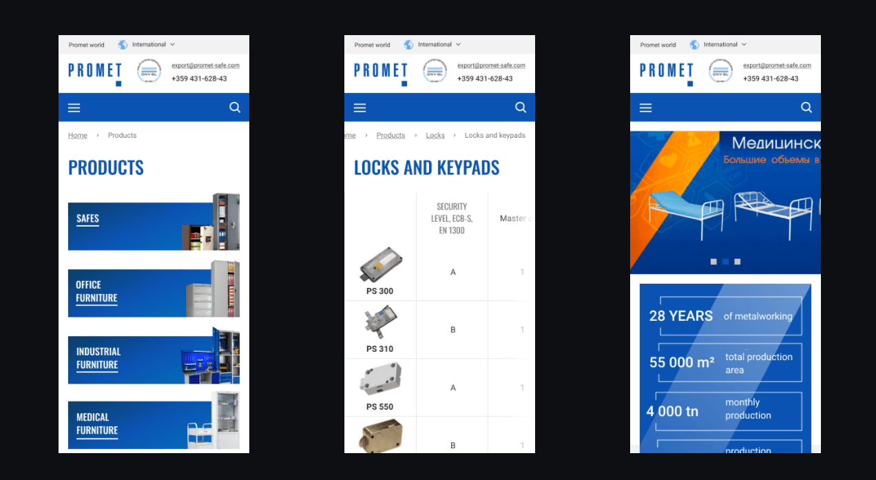 Требовалось разработать интернет-витрину, ориентированную на зарубежные рынки, для производителя металлической мебели ПРОМЕТ, взяв за основу существующую дизайн-концепцию материнского сайта (материнский сайт также был разработан нашей компанией ранее).