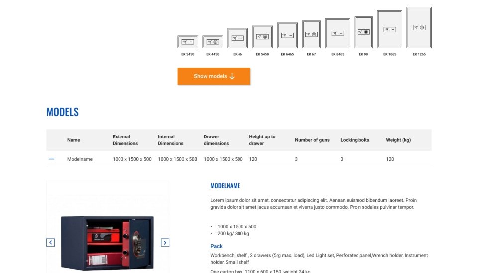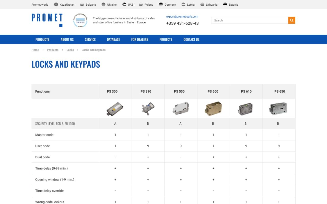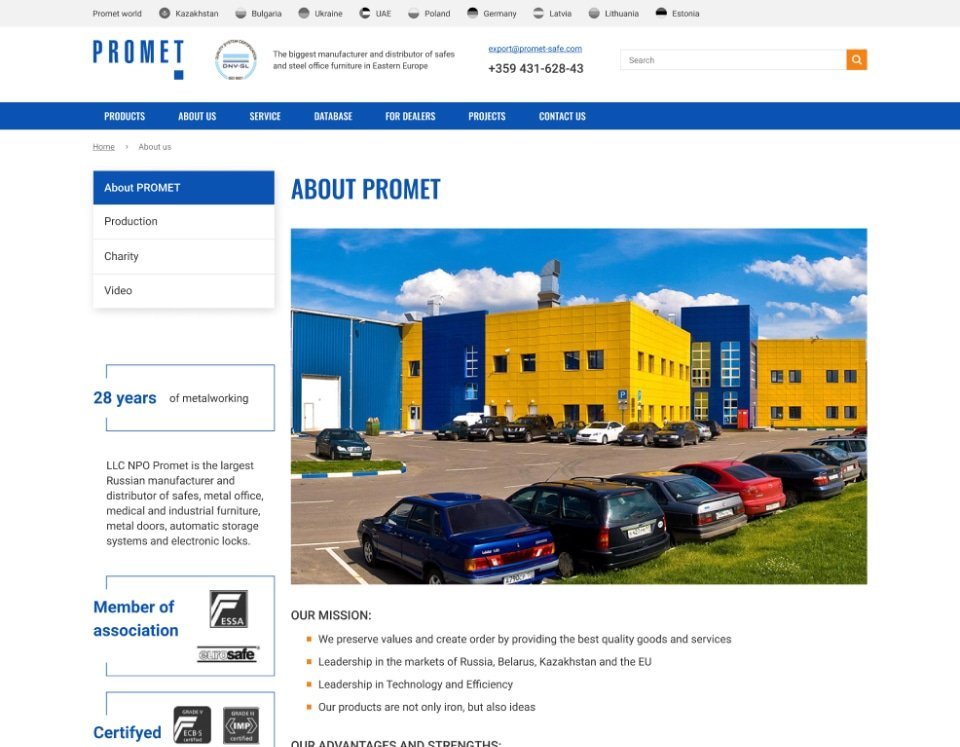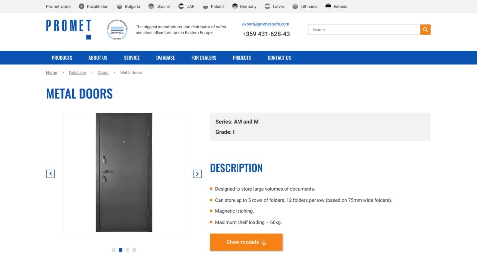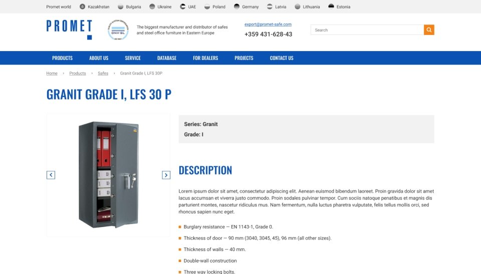 Несмотря на внешнюю схожесть и неотличимость на первый взгляд от головного сайта safe.ru, каталог продукции на promet-safe.com имеет значительные отличия. Все продукты умещаются в главном меню сайта, однако каждый продукт может иметь десятки моделей. Каждая модель имеет некоторые отличия по характеристикам и по внешнему виду. Также сами продукты могут быть настолько разными, что одним вариантом страницы товара не обойтись.