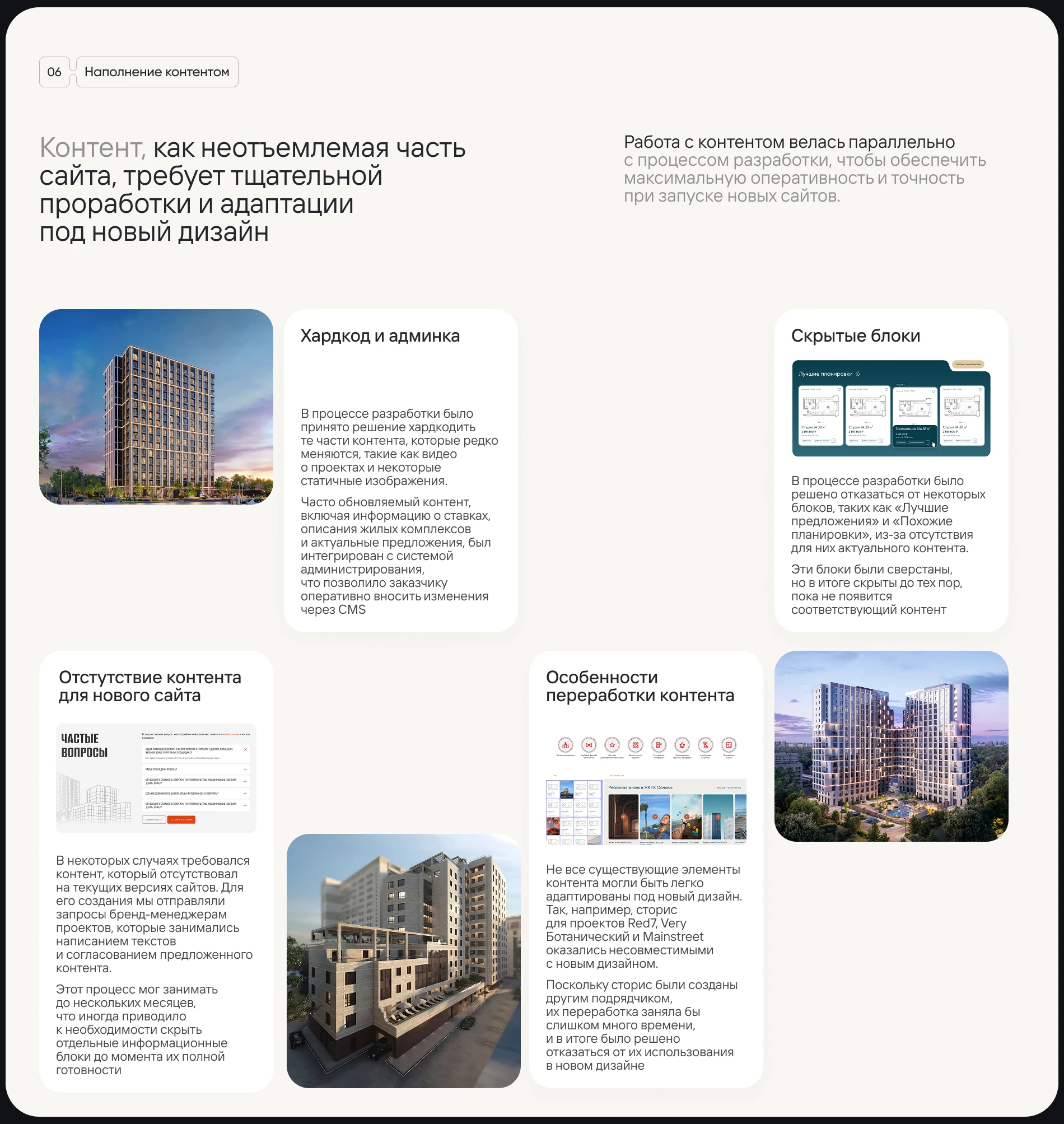 Для каждого из них потребовалось разработать уникальный дизайн и функционал, учитывая особенности каждого ЖК и их целевую аудиторию, состоящую из разных сегментов. При этом все они должны были следовать общей архитектуре и быть легко управляемыми.