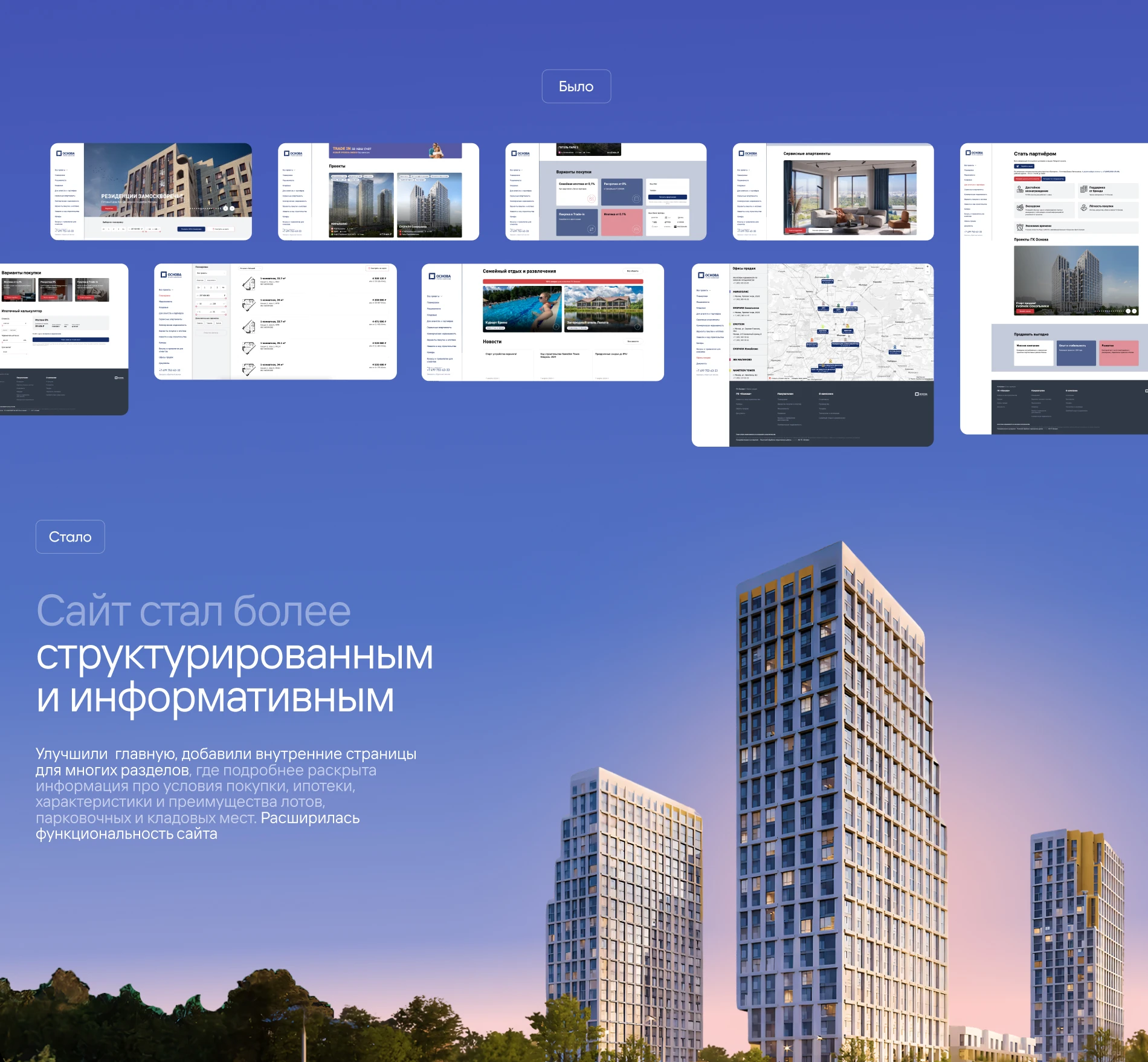 Сайт стал более структурированным и информативным. Улучшили главную, добавили внутренние страницы для многих разделов, где подробнее раскрыта информация про условия покупки, ипотеки, характеристики и преимущества лотов, парковочных и кладовых мест. Расширилась функциональность сайта.