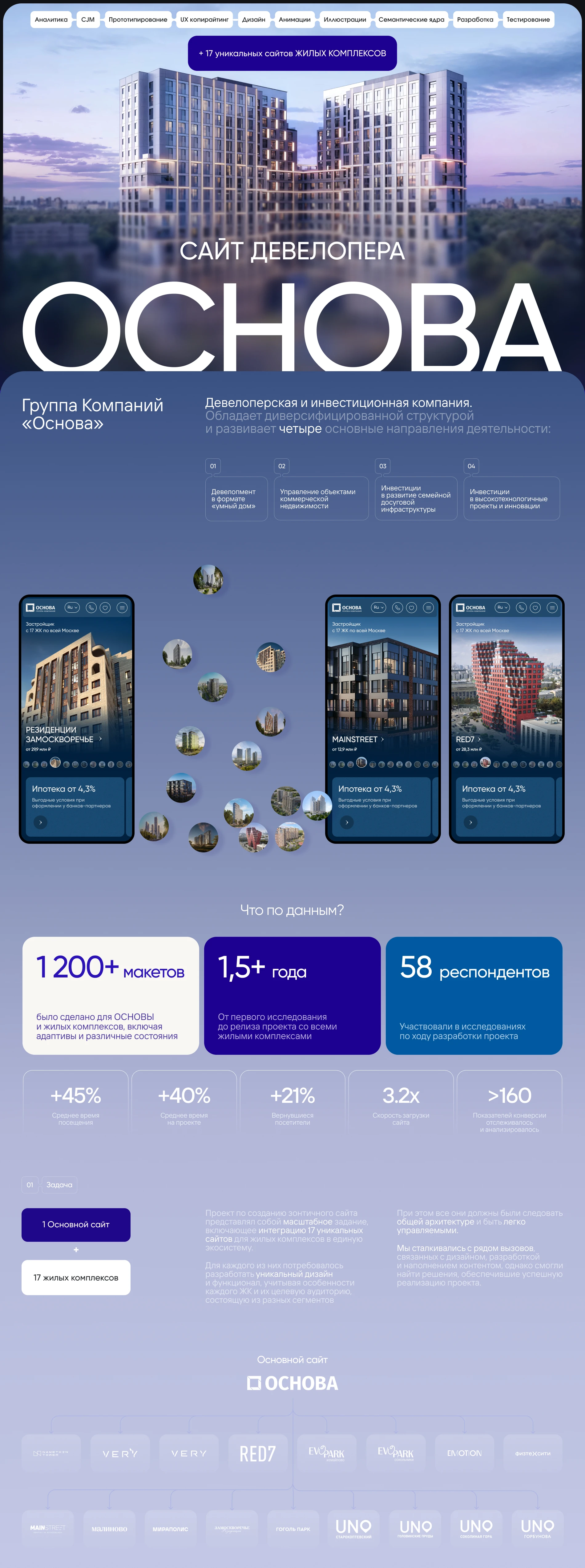 Проект по созданию зонтичного сайта представлял собой масштабное задание, включающее интеграцию 17 уникальных сайтов для жилых комплексов в единую экосистему.