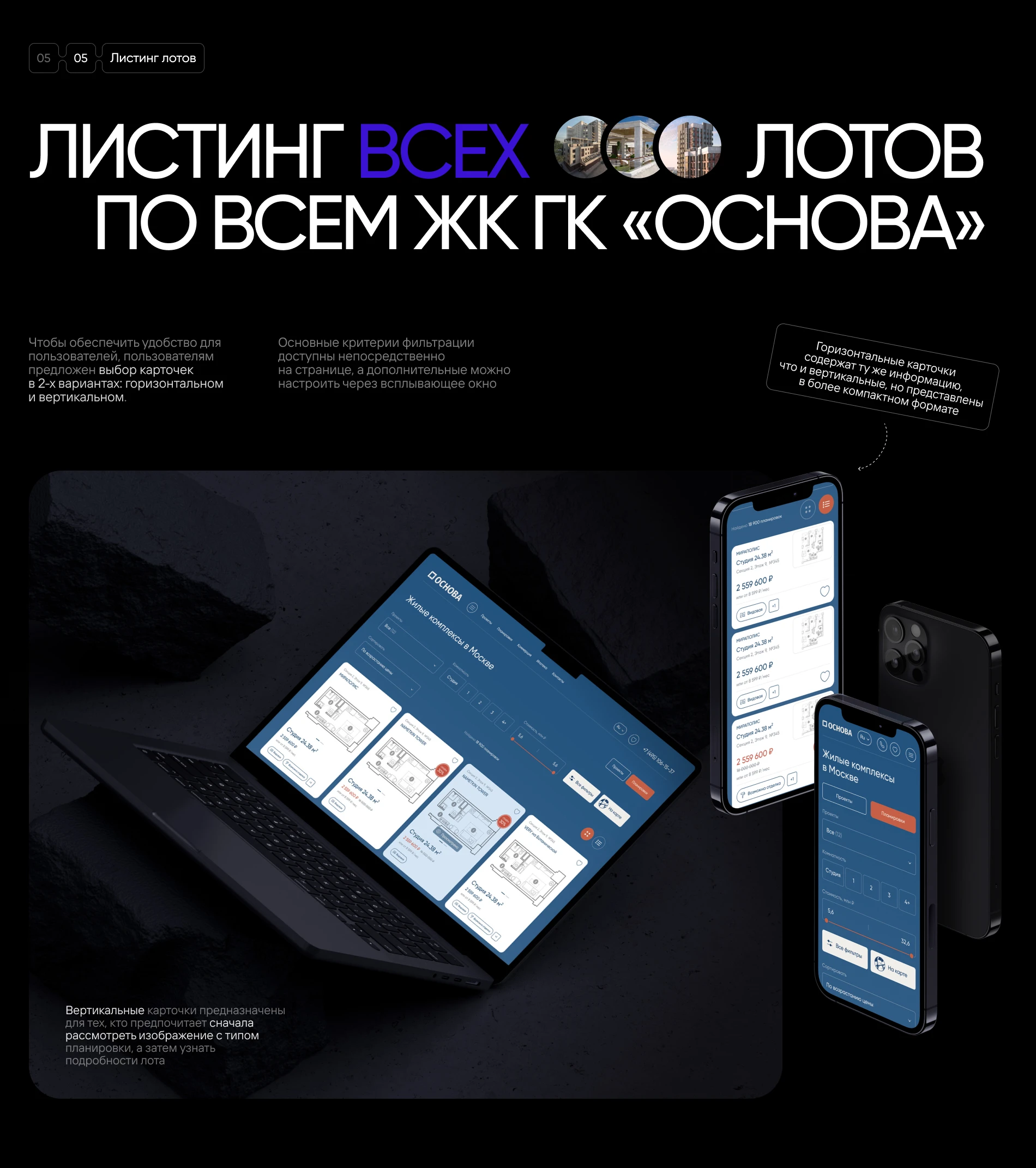 - Решить UX- и UI-вызовы, связанные с разнообразием объектов, и обеспечить высокое качество пользовательского опыта без потери уникальности каждого ЖК