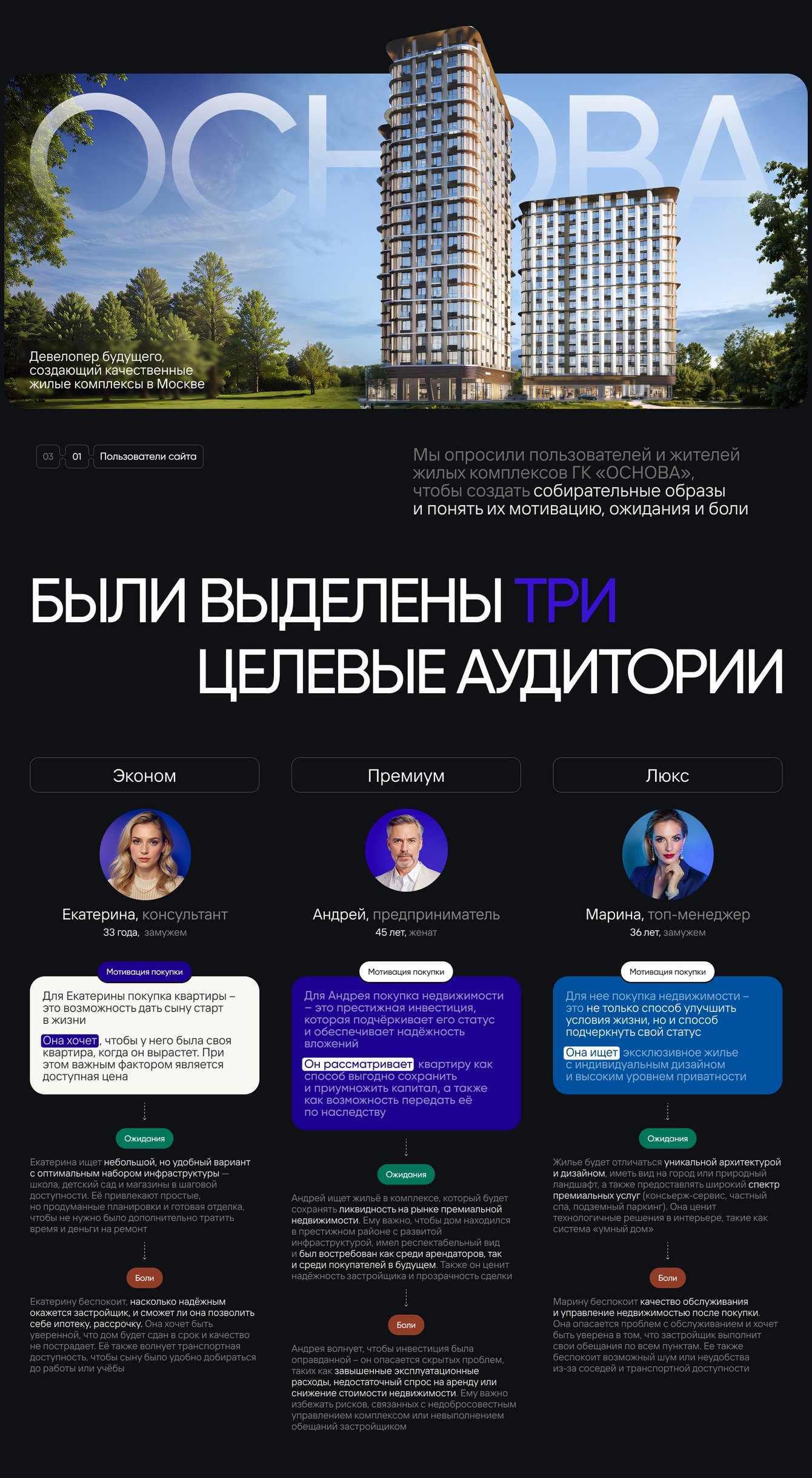 Мы опросили пользователей и жителей жилых комплексов ГК «ОСНОВА»,чтобы создать собирательные образы и понять их мотивацию, ожидания и боли.