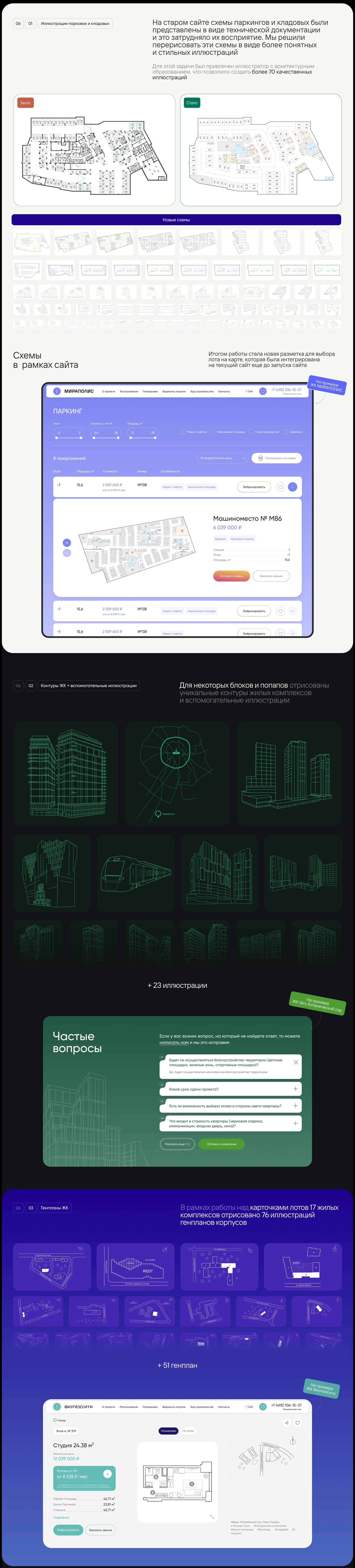 На старом сайте схемы паркингов и кладовых были представлены в виде технической документации и это затрудняло их восприятие. Мы решили перерисовать эти схемы в виде более понятных и стильных иллюстраций и это затрудняло их восприятие. Мы решили перерисовать эти схемы в виде более понятныхи стильных иллюстраций
